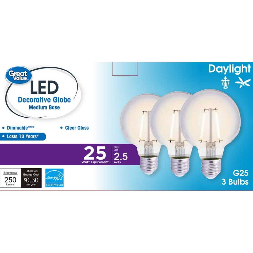 Great Value LED light bulbs are a cost-effective and energy-efficient option for lighting your home. The G25 bulb, also known as a Vanity bulb, is a globe-shaped bulb that is commonly used in bathroom vanities and makeup mirrors. These bulbs are available in different wattages and color temperatures, making them versatile for general or accent lighting depending on the desired effect. LED versions of these bulbs are more energy-efficient and have a longer lifespan than traditional incandescent bulbs. They are also dimmable and compatible with most dimmer switches in the market. The E26 medium Base makes it widely used in most lighting fixtures with an E26 standard socket.