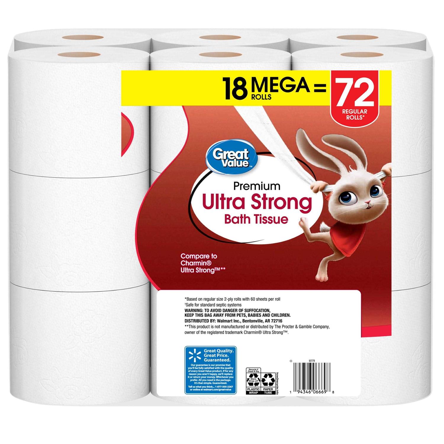 Great Value Ultra Strong Bath Tissue features 2-ply sheets of bathroom tissue that are super strong and absorbent, making them the perfect solution for your family. This bath tissue has the perfect combination of supreme strength and luxurious softness that you have been looking for, allowing you to get the job done without needing a large amount of paper in a single use. This toilet paper has supreme strength, which provides effective washcloth-like cleaning while being gentle on your skin. This pack comes with 18 mega rolls, so you get four times the sheets of regular rolls, meaning you won’t have to buy tissue rolls as often. Each long-lasting roll has a stylish embossed texture that not only helps in effective cleaning but also adds to the beauty of any bathroom. The rolls come in smartly sized bundles that are easy and convenient to store at the home or in workplaces. Bring home the Great Value Ultra Strong Premium Toilet Paper. Great Value products provide families with affordable, high-quality grocery and household consumable options. With our wide range of product categories spanning grocery and household consumables.