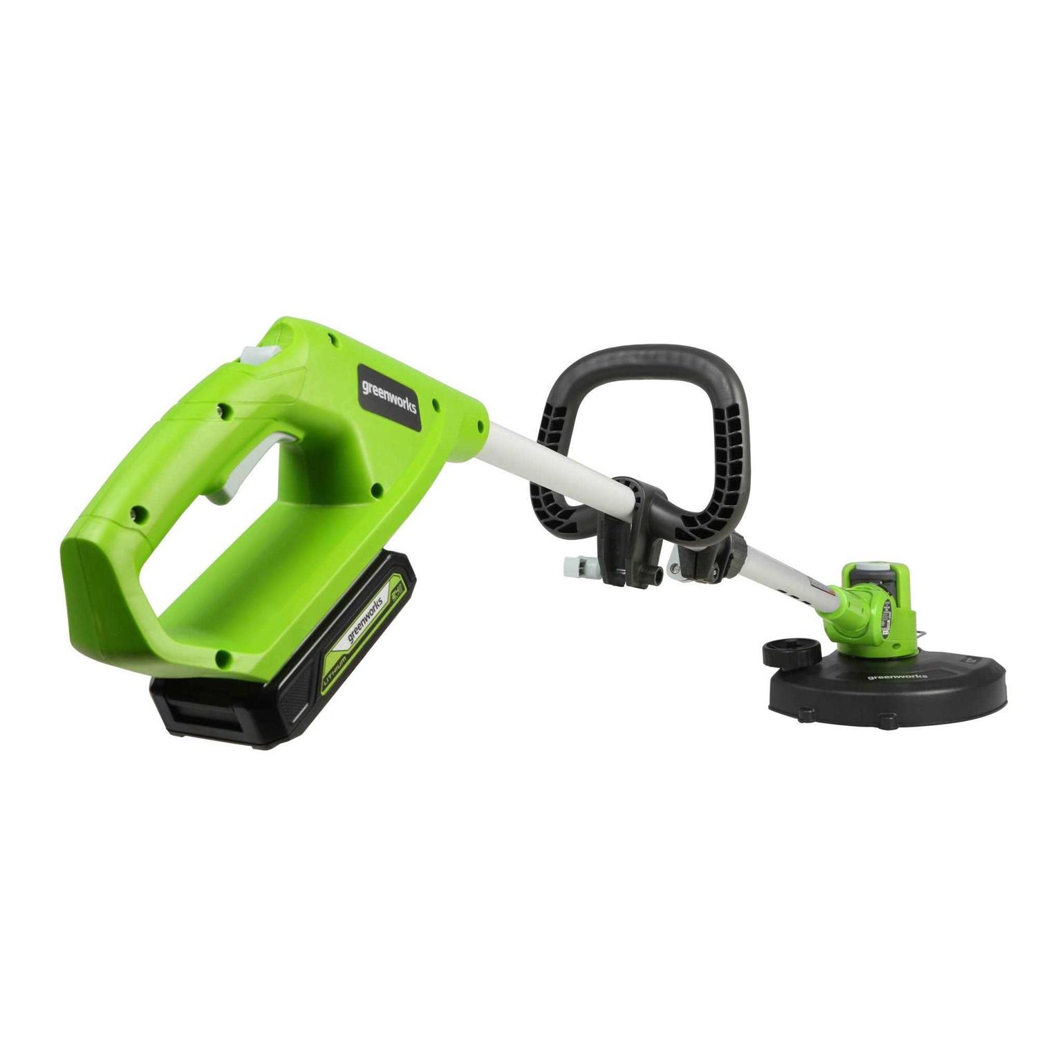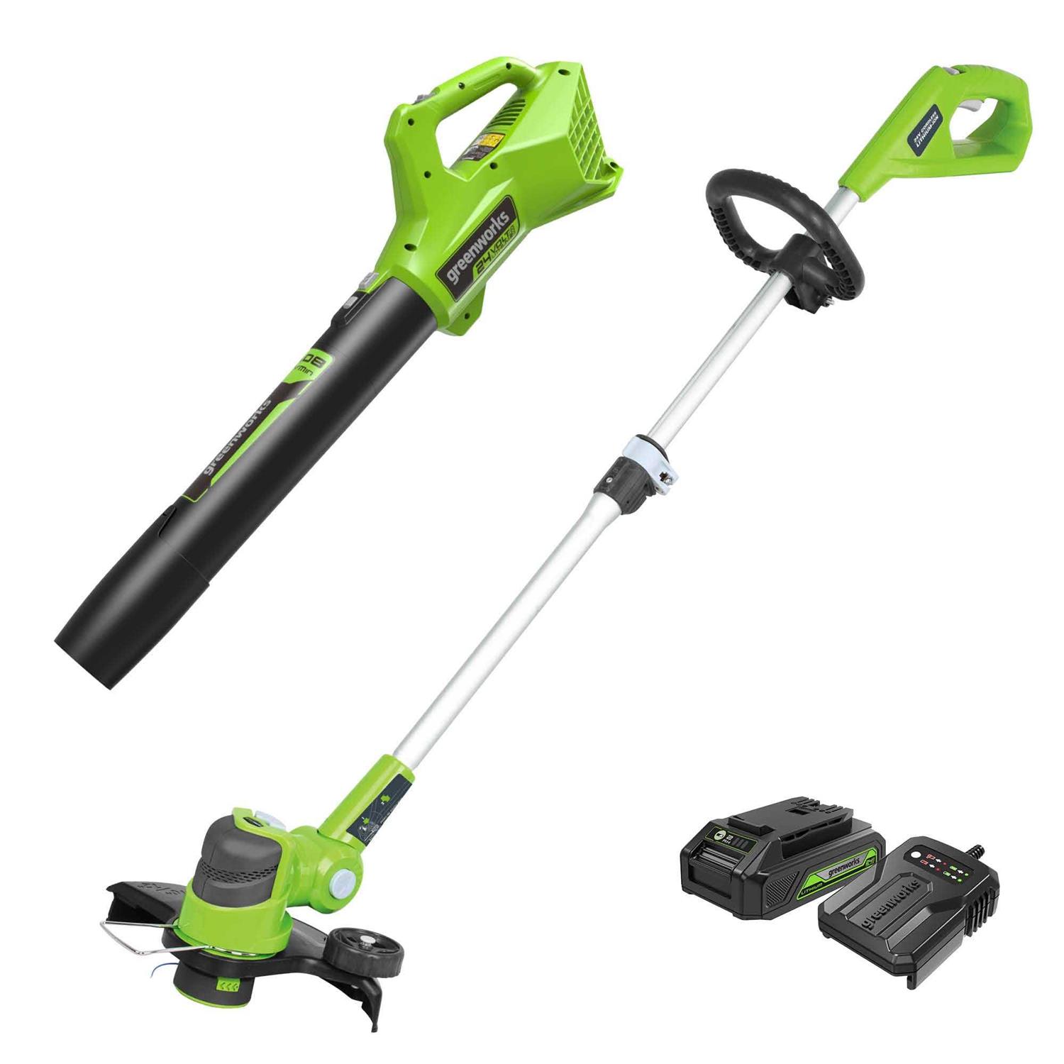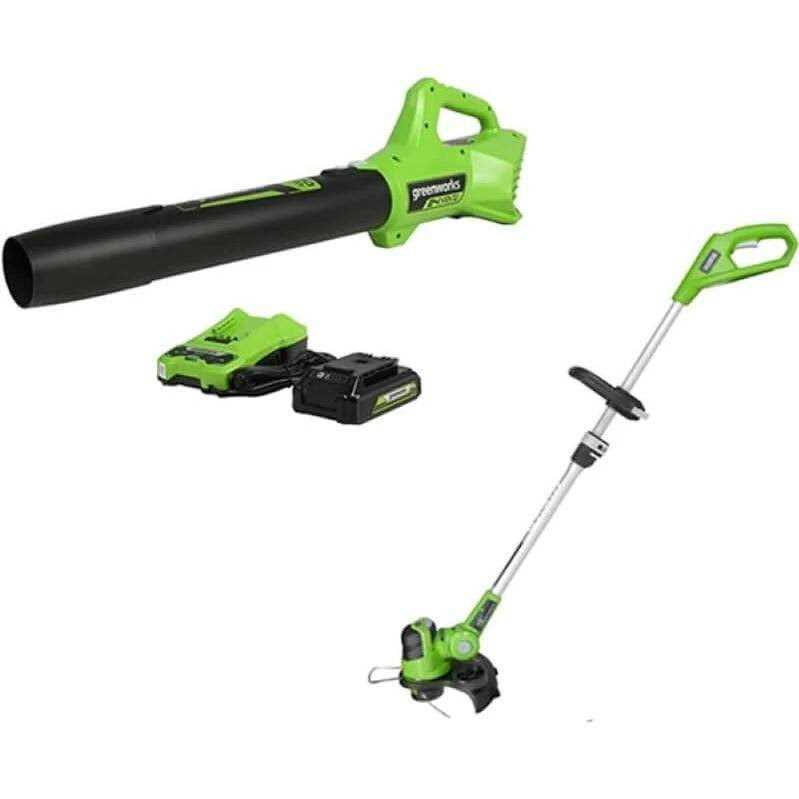 The Greenworks 24V 12″ String Trimmer and 320 CFM Blower Combo Kit features a 12-inch cut path and .065 line diameter auto-feed head for easy line advancement and innovative walk-behind edging with an attached wheel. The 24v Axial Blower features a variable speed trigger for optimized control. With 90 MPH and 320 CFM, blowing leaves, grass, and debris has never been so easy. Adjustable auxiliary handle with cushioned overmold grip maximizes control and minimizes arm fatigue. The Greenworks 24V POWERALL lithium-ion platform powers over 125+ indoor and outdoor products, including lawn mowers, blowers, string trimmers, chainsaws, power tools and more! The 24V lithium-ion battery provides 20percent more power and 35percent more run time (compared to 20-volt products) while delivering fade-free power with no memory loss after charging.