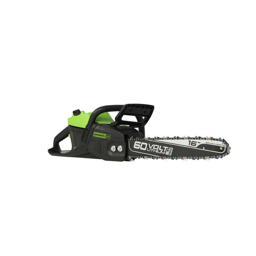 Powered by a Greenworks Pro 60V UltraPower lithium-ion battery (battery & charger sold separately), this Greenworks Pro cordless chainsaw delivers the power and performance of typical gas-powered saws, without the noise, fumes, or harmful emissions. The battery-powered brushless motor delivers 20% more torque and faster cutting than a 42cc gas-powered chainsaw, and it features our No Prime, No Choke, No Pull easy-starting system for fast starts every time, with no aggravating pull cord. This lightweight cordless chainsaw is equipped with a 16-inch bar and chain, pro-style side-mounted chain tensioning for easy bar and chain maintenance, automatic chain oiler, transparent oil fill window, and inertia-activated chain brake. The powerful Greenworks Pro 60V UltraPower cordless battery platform gives you all the power you need to tackle all your lawn care projects. Kick gas to the curb this spring and go green with no fumes, no mixing, no maintenance and no pull cords. Let Greenworks help you take the work out of yard work.