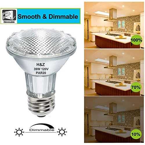 Halogen Bulbs by H&Z. Details:High brightness and warm light: Par20 halogen light bulbs, high brightness 480lumens, 3000k warm bright light with 40 degree beam control, generating yellowish light, which is good for your eye protection. Safe to use: Par20 dimmable, Mercury free and no UR/IR radiation, safe for your home and the environment. Applications: par20 halogen 39w is suitable for office, stores, recessed cans, track lighting, range hood, stovetop, living room, restaurants, retail shops, bar, exhibition, art galleries and entertainment lighting. Our professional after-sales team will make things right within 24hrs. Buy with confidence! Specifications: Voltage:110V 120V 130V Watts: 39W Base Type: E26 medium base Color: 3000K (Standard Warm White-yellowish) Brightness: 480lm Beam angle: 40 degree Bulb size: 2.5×3.