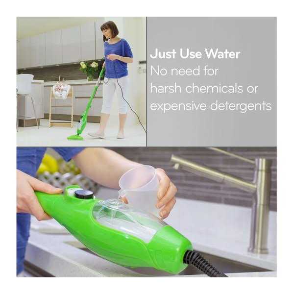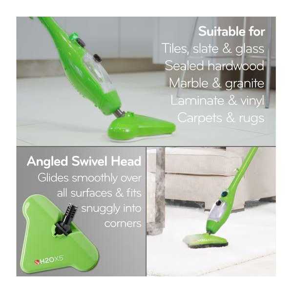 Product Description H2O X5 steam mop provides an adaptable, lightweight and fast way to clean and disinfect your home hygienically. It is non-toxic and eliminates the need for cleaning chemicals by heating up in just 15 seconds. It can sanitise and kill 99.9 Percentage of germs, viruses and bacteria from floors, surfaces and fabrics. It is easy to manoeuvre around your home and furniture with the swivel head and its light weight and handheld function make cleaning every surface simple, including those hard to reach places. With its variable steam setting it is suitable for hard sealed floors, slate, granite, marble, laminate, vinyl, linoleum, ceramic, wood and, using the included carpet glider, carpets.