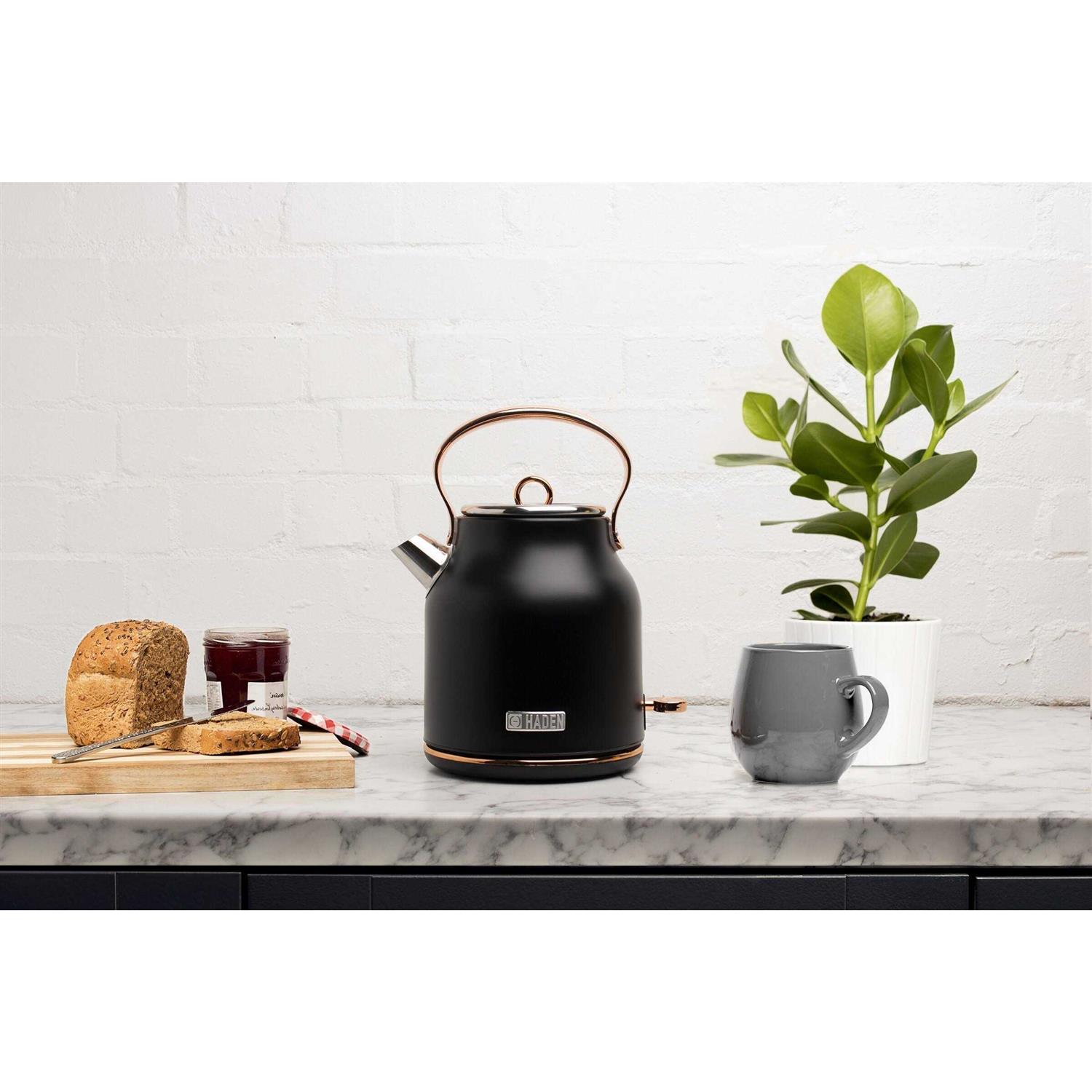 Add a touch of British Flair to your interior with Haden Heritage Black & Copper 360 Cordless Kettle. With a great capacity of 1.7L, it features a built-in filter that removes limescale and other build-up impurities that can cause damage to the kettle. It comes with a spare removable filter for convenience. The large handle of the kettle allows full control when pouring and a firm grip. Made with high-grade BPA-free & stainless-steel material, this fast-boil electric kettle contains boil-dry cut-off protection, preventing accidents if left unattended for an extended time. Designed to please, this product has a blue indicator light when the kettle is boiling. Aesthetically designed with smooth edges and retro lines to fit contemporary and modern kitchens. Match up your kettle with Haden Heritage Black & Copper to create a set that will uplift the look of your kitchen.