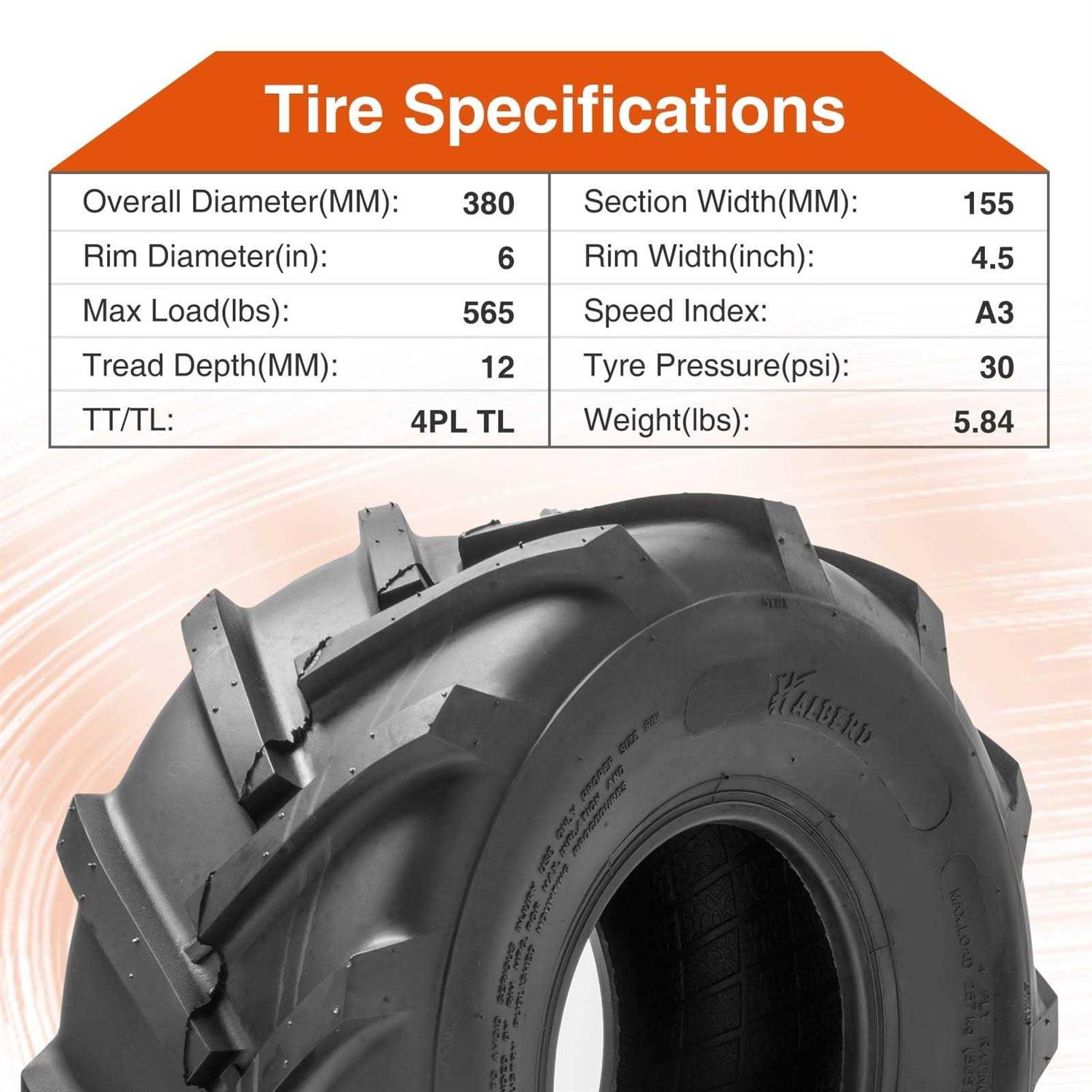 HALBERD P328 Lawn & Garden Tires ensure strong traction and provide better control over rough terrain The special lug design provides great traction, excellent grip and long life. Size 15×6.00-6 Brand HALBERD Section Width 155 Millimeters Rim Width 4.5 Inches Load Capacity 565 Pounds Tread Depth 12 Millimeters Load Index Rating 61.00 Tire Aspect Ratio 75 Rim Size 6 Inches Speed Rating A3