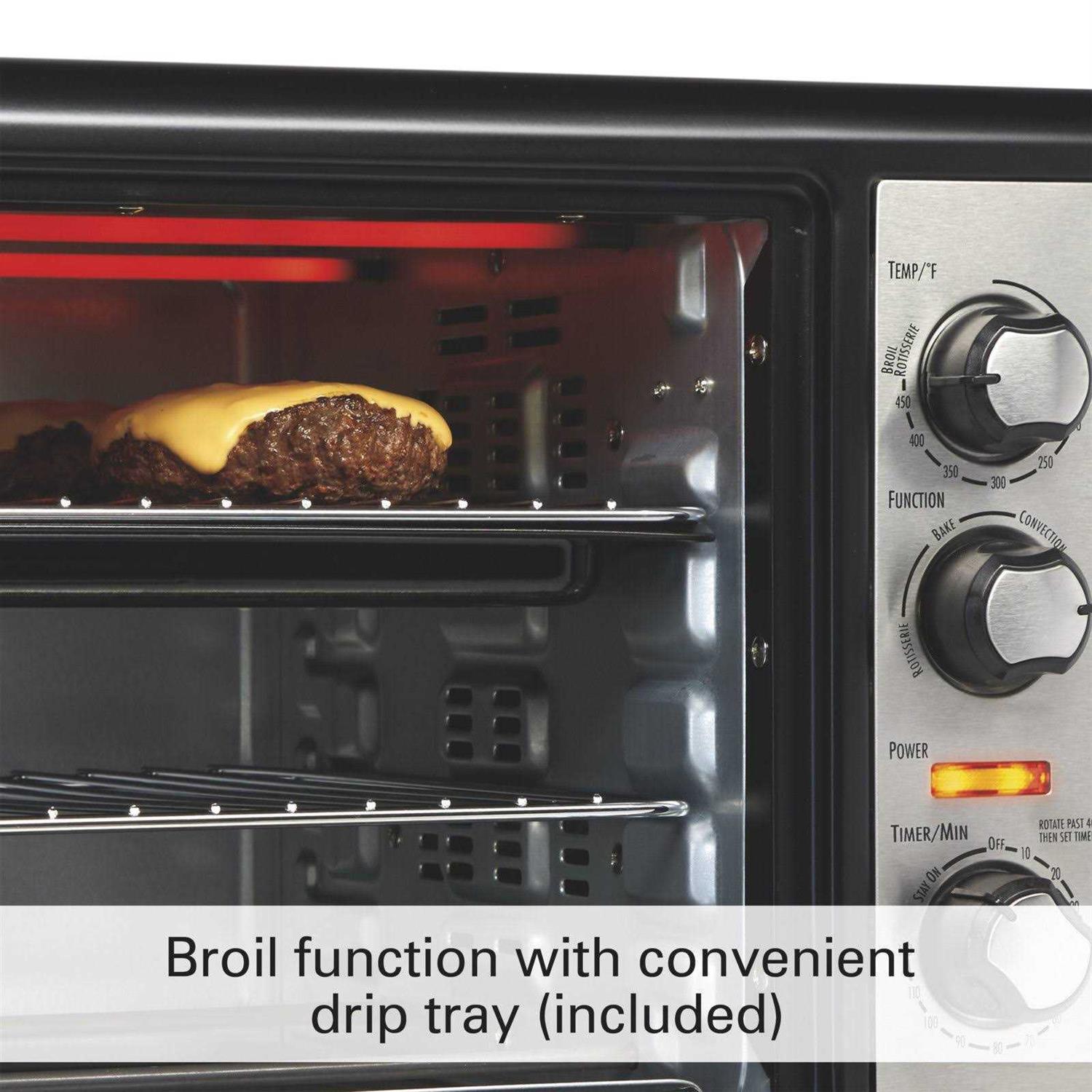 With 1500 watts of cooking power, the Hamilton Beach Countertop Oven with Convection & Rotisserie does everything your full-size oven does, while taking minimal space on your countertop. Whether youre baking cakes, broiling salmon or roasting an entire 5 lb. chicken, this oven has plenty of space the ideal size for cooking family meals. The wide interior and two adjustable cooking racks provide double the space for cooking multiple foods at once, like two 12 inch pizzas. Cook a variety of foods to perfection. Bake, broil, roast on the rotisserie or use the convection setting to take your baking results to the next level. Convection bakes faster and more evenly than traditional ovens. The countertop oven is easy to use with simple dials to turn, yet its packed with convenient features. It has automatic shutoff, a 2 hour timer and a Stay On setting for foods that need extra cooking time. Easily create that store-bought rotisserie flavor at home. The revolving skewer revolves to lock in flavor and juices, while the outside of meat gets brown and crispy. The countertop oven includes: a bake pan/drip tray, rotisserie accessories, 2 cooking racks and a slide-out crumb tray for easy cleanup.