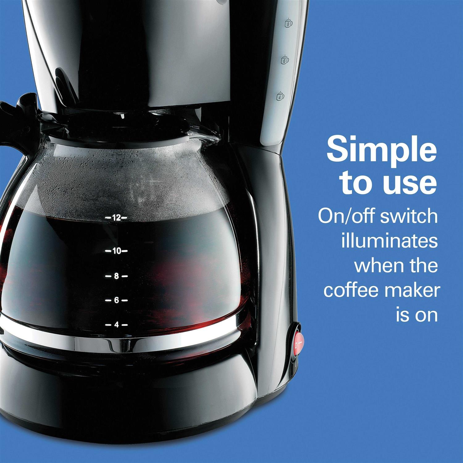 Hamilton Beach black switch 12 cup coffee maker features a sleek design and straight forward functionality to let you easily brew up to 12 piping hot cups of your favorite coffee. Uses ground coffee Pause & Serve function delivers first cup convenience letting you pour a cup even in the middle of a brewing cycle. Nonstick carafe warming plate. Brews up to 12 cups of coffee. Includes glass carafe. Easy fill water reservoir with large water window. Reservoir capacity: 12 cups. Removable cone shaped filter basket extracts coffee’s rich, complex flavor On/Off button. Lighted power “On” indicator. Cord storage. Plastic housing. Wipe clean exterior. Dishwasher safe filter basket and carafe. Dimensions: 10″ D x 8.5″ W x 13″ H. Weighs 5.2 lb. UL listed.