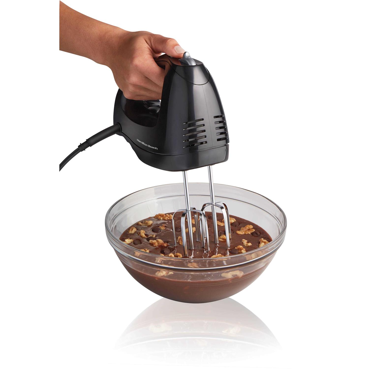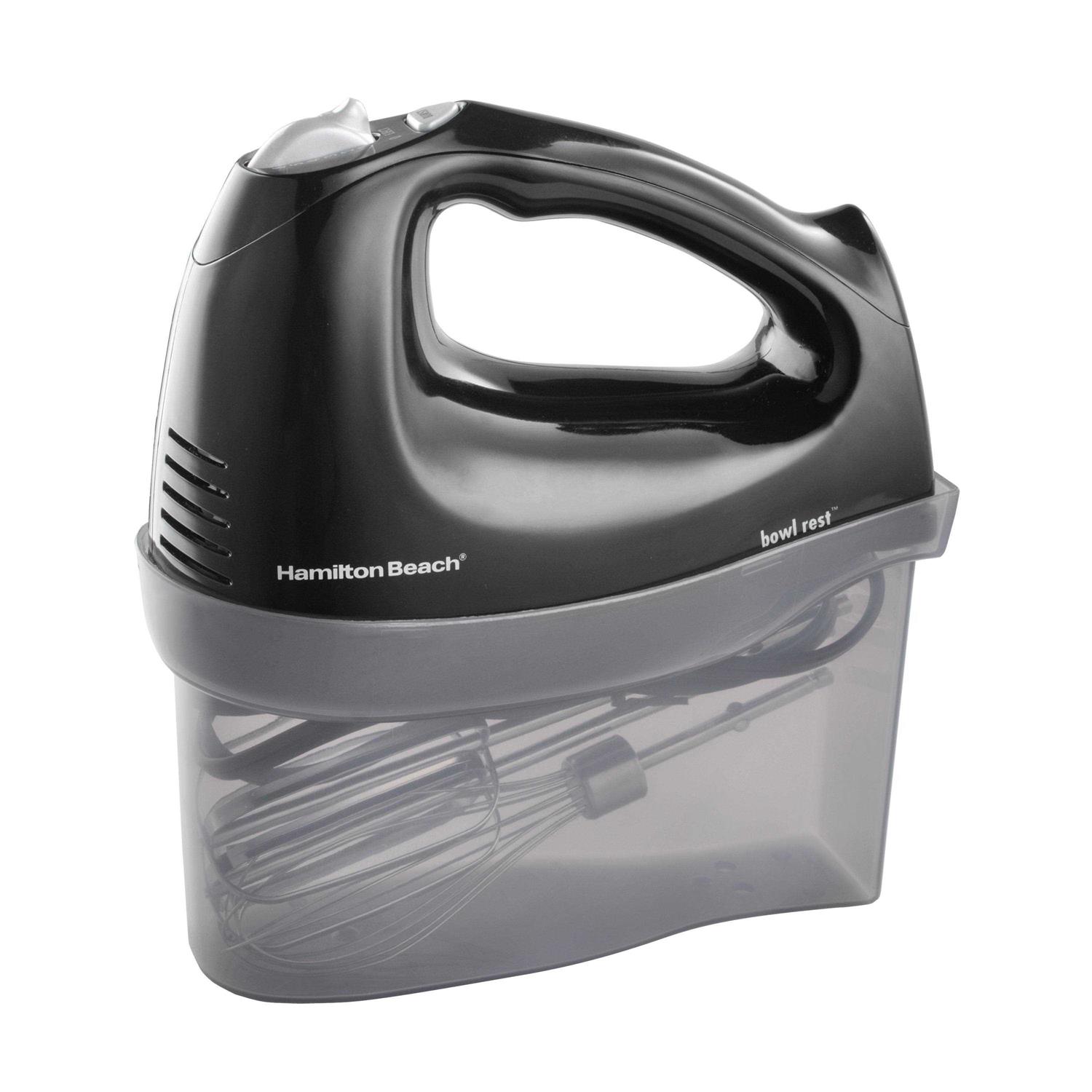 The Hamilton Beach Black Hand Mixer with Snap-On Case is a must-have appliance for every active kitchen. Well equipped to take care of all your mixing jobs, this sleek, black Hamilton Beach mixer has six different speed settings. From silky cake batter to the toughest cookie dough, you can mix it all with the Hamilton Beach Hand Mixer with Snap-On Case. With 250-watts of power and a QuickBurst feature, you’ll be guaranteed quick and perfect mixing every time. With an individual whisk attachment and traditional beaters, this attractive Hamilton hand mixer lets you finish off your mixing job in a flash. With its accompanying snap-on storage case for instant storage, the Hamilton Beach Black Hand Mixer is an exceptional value. Makes a great gift for the home cook or those equipping their first kitchen!
