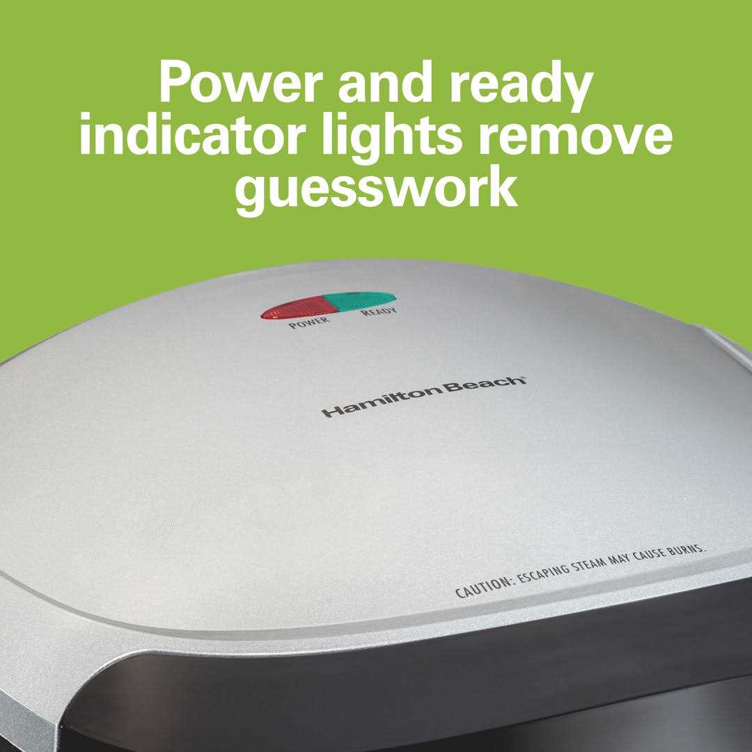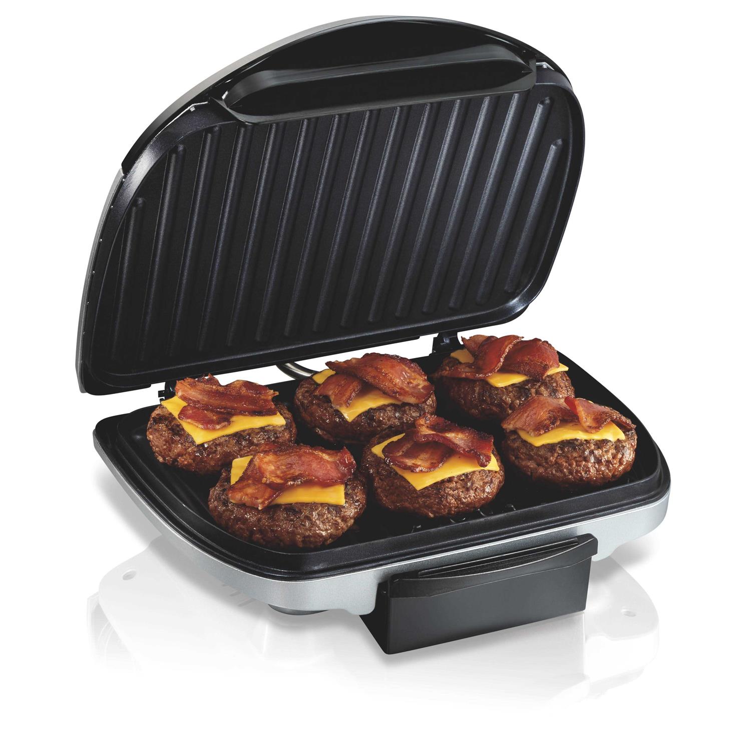 Enjoy delicious grilled foods year-round with the Hamilton Beach Indoor Grill. The large 90 square inch nonstick cooking surface can accommodate up to six servings, an ideal size for family meals and parties. Equipped with powerful heating elements, this indoor grill cooks most foods in 10 minutes or less, making it perfect for quick weeknight dinners. Use it to grill burgers, boneless chicken, lean meats, fish and vegetables. Plus, the convenient slide out drip tray is dishwasher safe. The large handle offers a secure grip while cooking, and the floating hinges adjust to the thickness of food. When finished, the nonstick grill plates easily wipe clean. The large 90 square inch nonstick cooking surface can accommodate up to six servings – an ideal size for family meals and parties. Equipped with powerful heating elements, this indoor grill cooks most foods in 10 minutes or less.