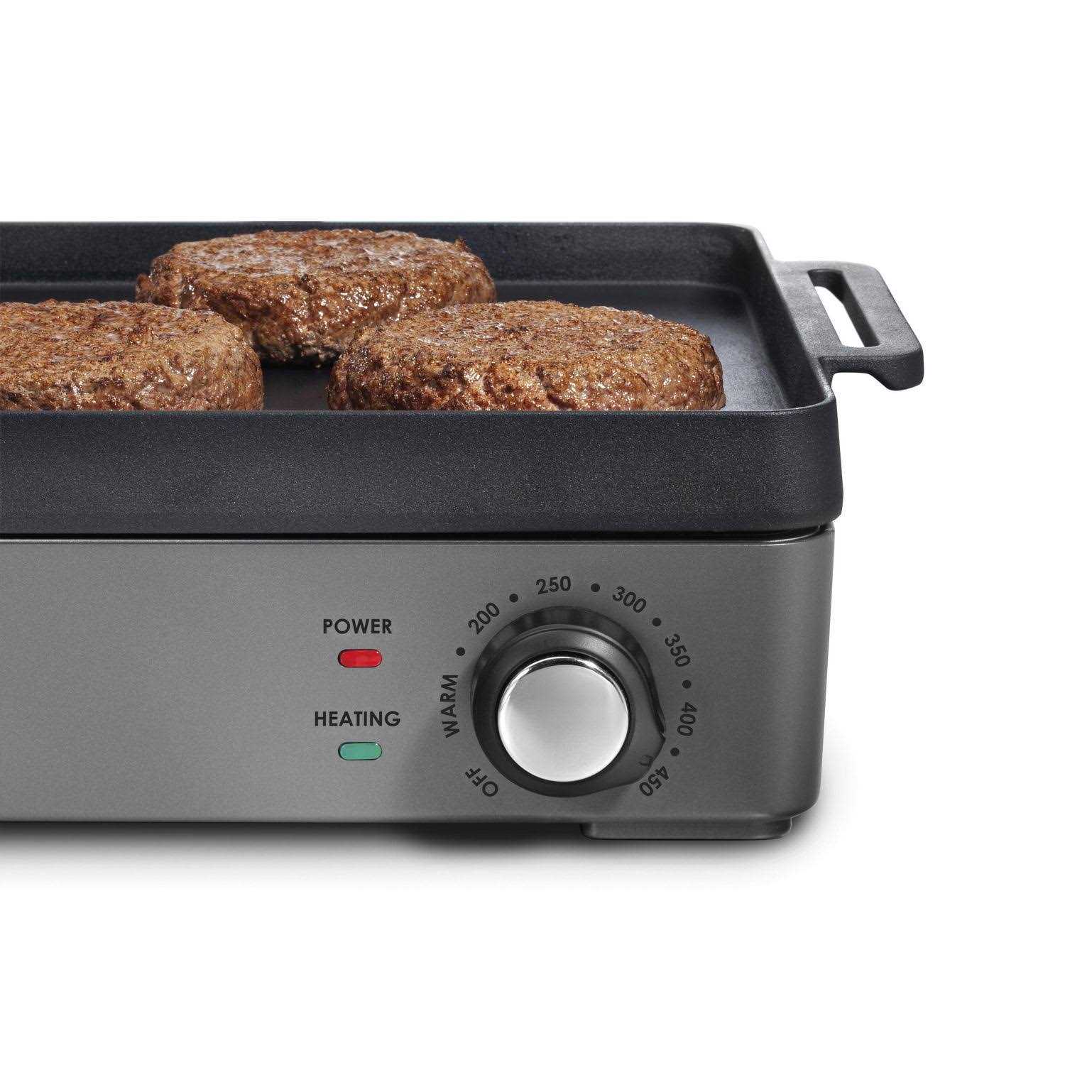 The Hamilton Beach Professional cast iron electric grill has a large 10″ x 16″ cooking surface that’s perfect for preparing complete family meals and breakfasts that are too large for a skillet. It will be your go-to grill for cooking everything from steaks and burgers to chicken, fish, and vegetables like a pro. It sears meats and other foods on high heat to lock in delicious flavor for professional results. The temperature is adjustable from warm up to 450° F. The grill surface is made of durable cast iron that is preseasoned to reduce sticking and save time and effort. Cast iron is a hard surface that is naturally scratch-resistant even when using metal utensils. Cast iron also holds heat better than aluminum for evenly browned and cooked foods. With the convenient drain, it’s easy to push excess grease into the removable drip tray that slides out for easy grease disposal or recycling. The drip tray is top-rack dishwasher safe and the removable cooktop easily wipes clean. The cord wrap keeps excess cord off the countertop and reduces clutter.