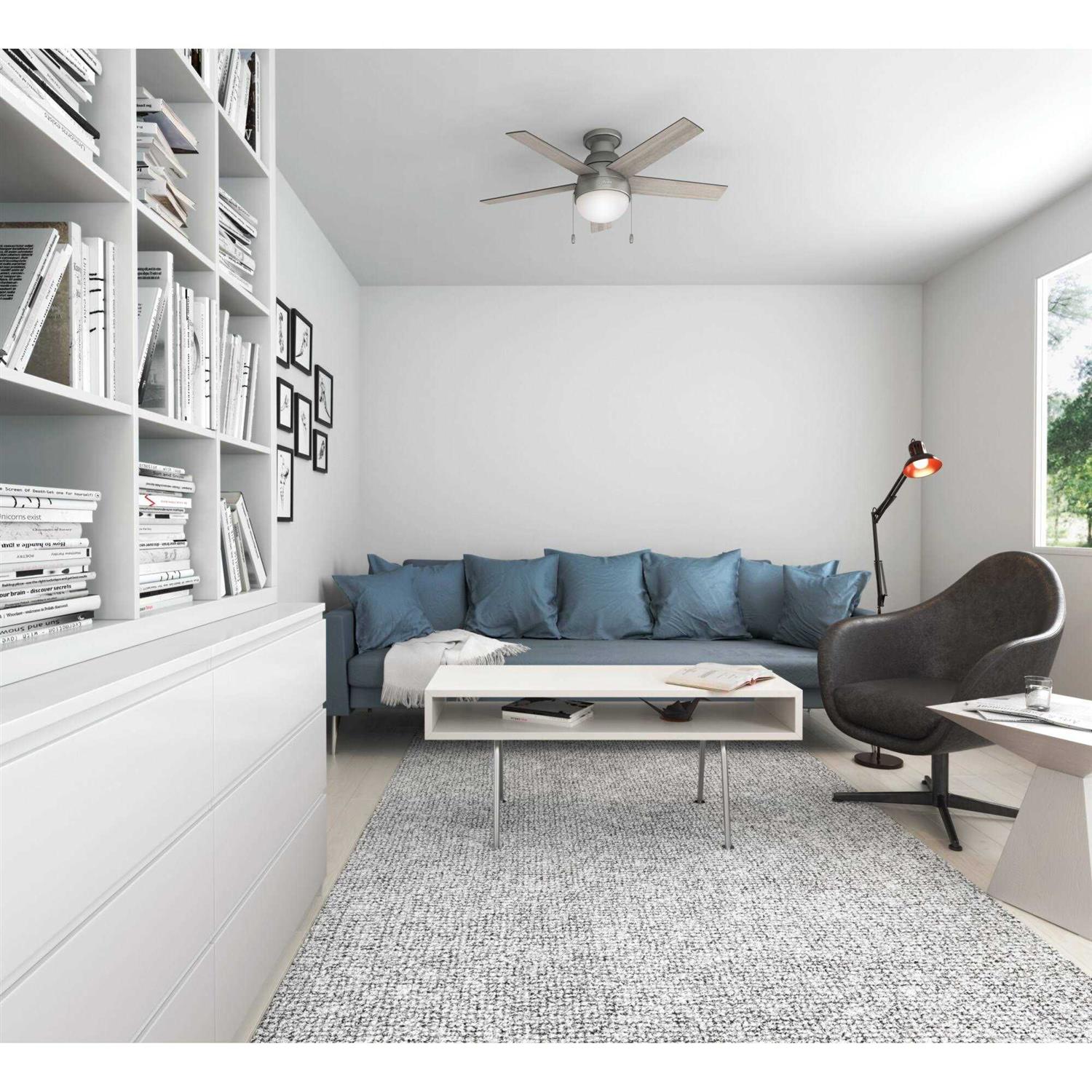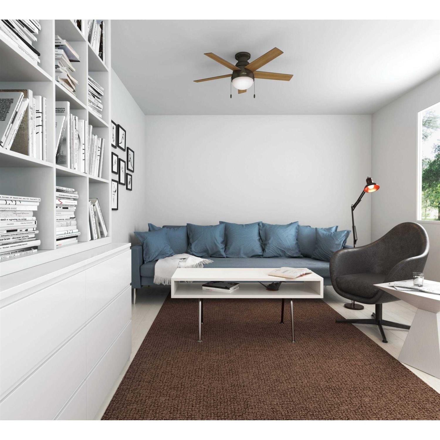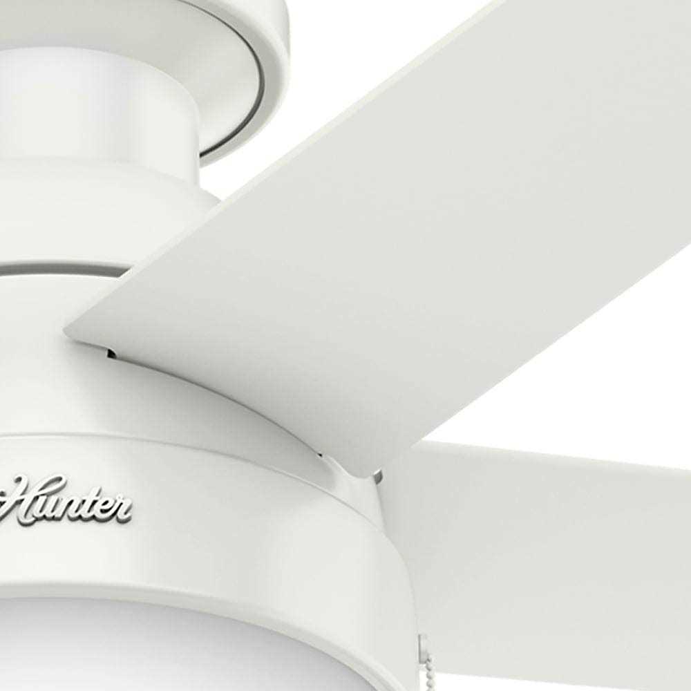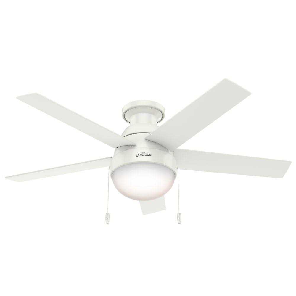 Hunter Fans From the ceiling all the way down to the glass, the Anslee maintains a consistent curve resembling a refreshing drop of water. This fan is an excellent accent to your contemporary decor. It shines enough light and moves enough air to be the ideal fit for small or standard size rooms and the low profile hanging system is great for low ceilings. Includes integrated light kit with cased white glass. Reversible blades. Number of blades: 5. 13 Degree blade pitch optimized to ensure ideal air movement and peak performance. For indoor use only. Fan speeds: 3. Frequency: 60Hz. RPM: 50-181. CFM: 1411.51-3954.87.