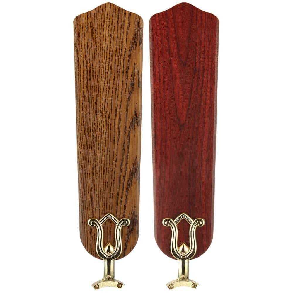 Polished Brass Ceiling Fan features a traditional hugger design with updated styling and 5 reversible blades of rosewood and medium oak wood-tone finishes. A turtle-style light fixture with glass shades provides convenient room lighting. A triple-capacitor speed control promotes quiet operation while the Power Plus 153 mm x 18 mm motor delivers plenty of airflow for larger spaces. Uses four 9.5-Watt LED bulbs. 5 reversible rosewood/bleached cherry blades make it easy to change your decor style without purchasing a new fan Updated turtle light kit with hammered glass shades Triple-capacitor speed control for quiet operation Updated traditional hugger design in polished brass Designed for indoor use Large room sizes from 12 ft. x 12 ft. to 18 ft. x 18 ft. Power plus 153 mm x 18 mm motor for great air movement Designed for large rooms up to 20 ft. x 20 ft.