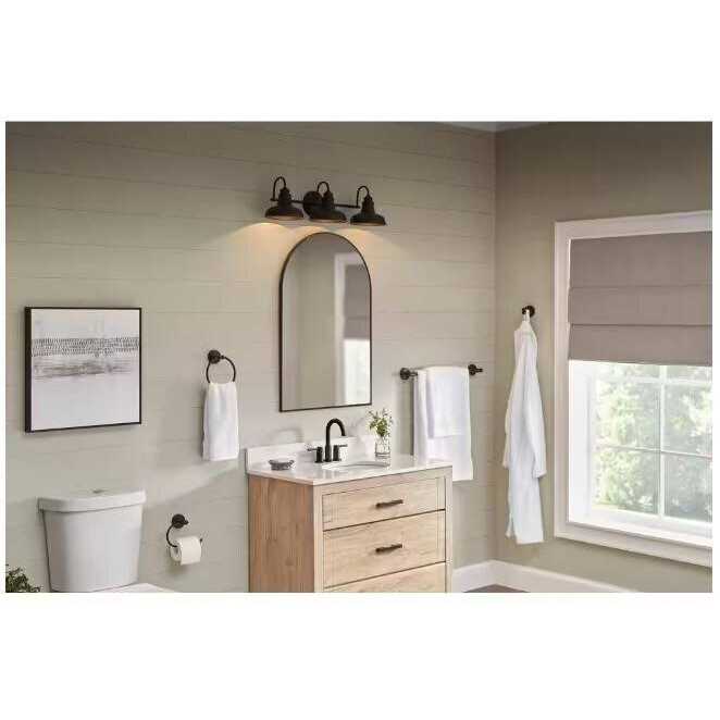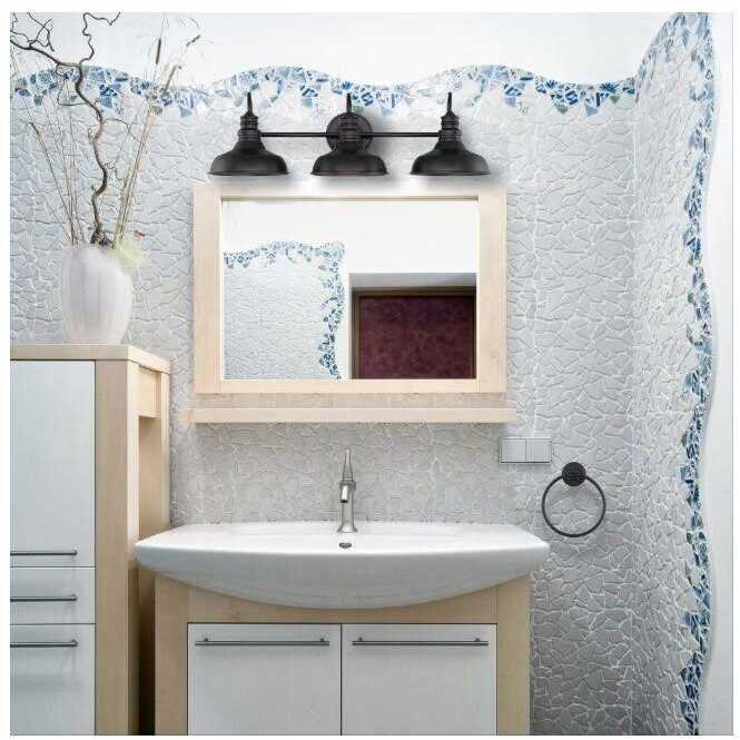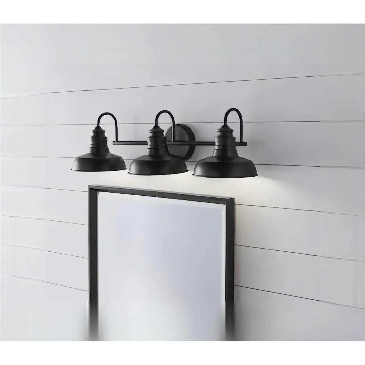 The Elmcroft family of light fixtures adds a farmhouse touch to your interior décor. With its sleek matte black finish and metal shades, the Elmcroft vanity light will light up the room and provide years of enjoyment. This wall-mounted light is perfect for bathrooms, bedrooms, and above mirrors in other areas of your home. Elmcroft bath vanity lights are easy to install with included instructions and hardware, and should be hardwired to an in-wall 120V power source. This vanity fixture requires (3) E26 60W max incandescent bulbs, or the LED equivalent, which need to be purchased separately.