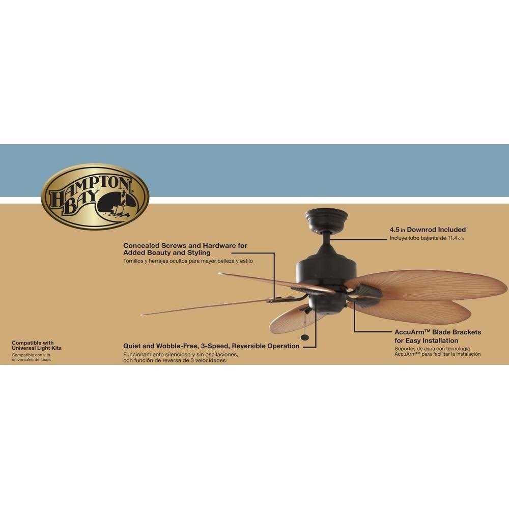Add a touch of the tropics to your outdoor living space with the 52 in. This wet rated fan marries form and function with its palm leaf inspired design and powerful 3-speed reversible motor. The Lillycrest has an aged bronze finish complimented by 5 toasted almond finish ABS blades to withstand the outdoor elements. The Lillycrest is a breeze to install with QuickFit installation features like QuikInstall blades a slide-on mounting bracket and AccuArm blade brackets. This fan is also light kit adaptable with universal light kits (sold separately).