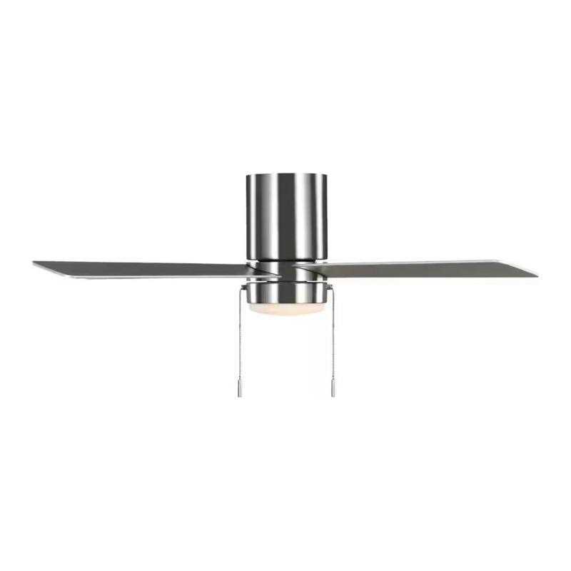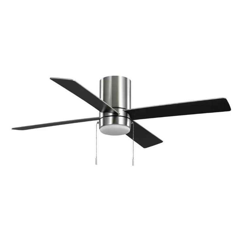 Scenic ceiling fan offers modern style and quiet performance to enhance your indoor living spaces. Installation is a breeze with Quick Fit features like a slide-on mounting bracket and twist and lock glass shade. The integrated LED offers ample illumination with a frosted glass shade. Designed for flat ceilings, the hugger design is perfect for rooms with low ceilings. The fan’s brushed nickel finish is complemented with 4 reversible blades in matte black and silver finishes to give you different design options. Operating the fan’s 3-speed reversible motor and light is easy with the included pull chains.
