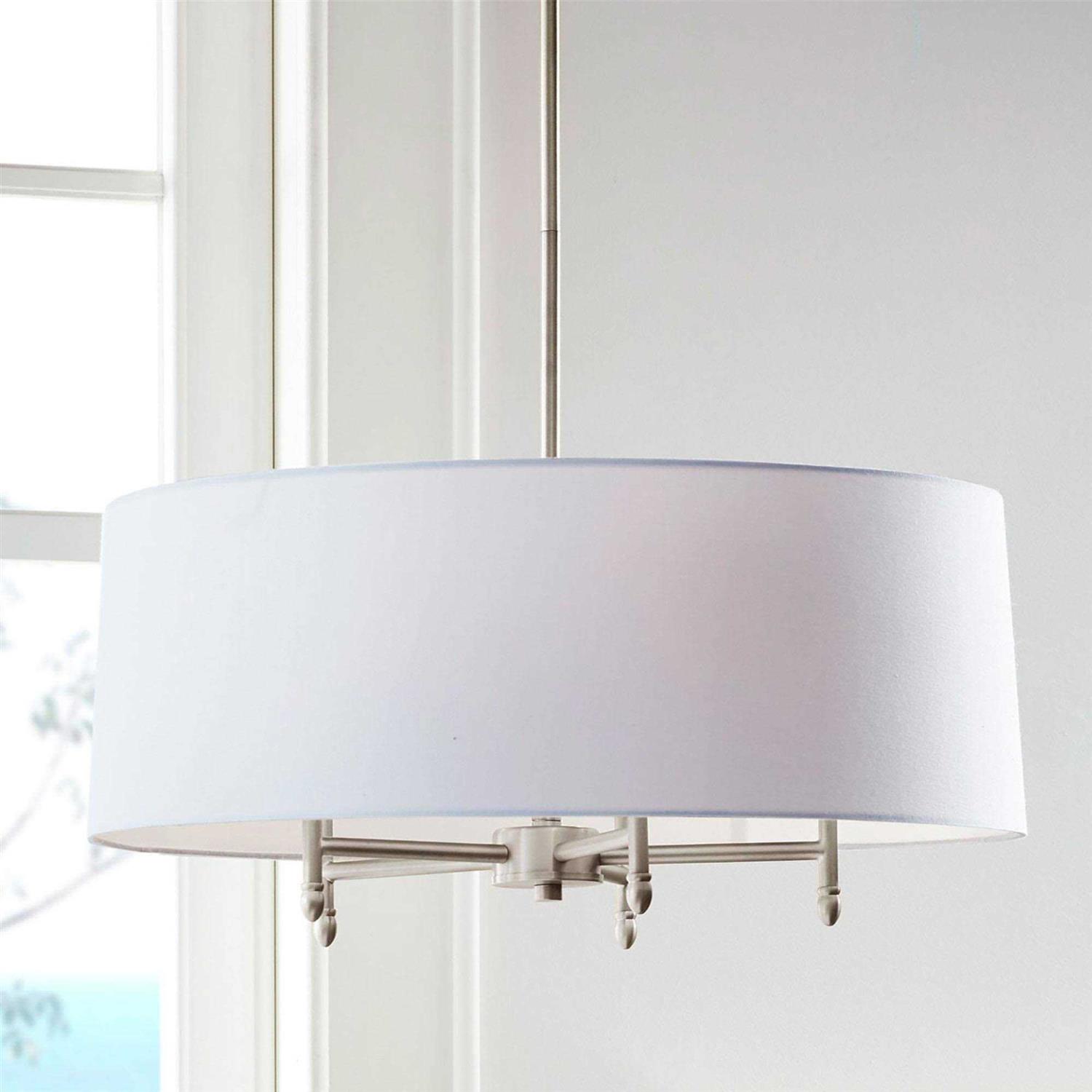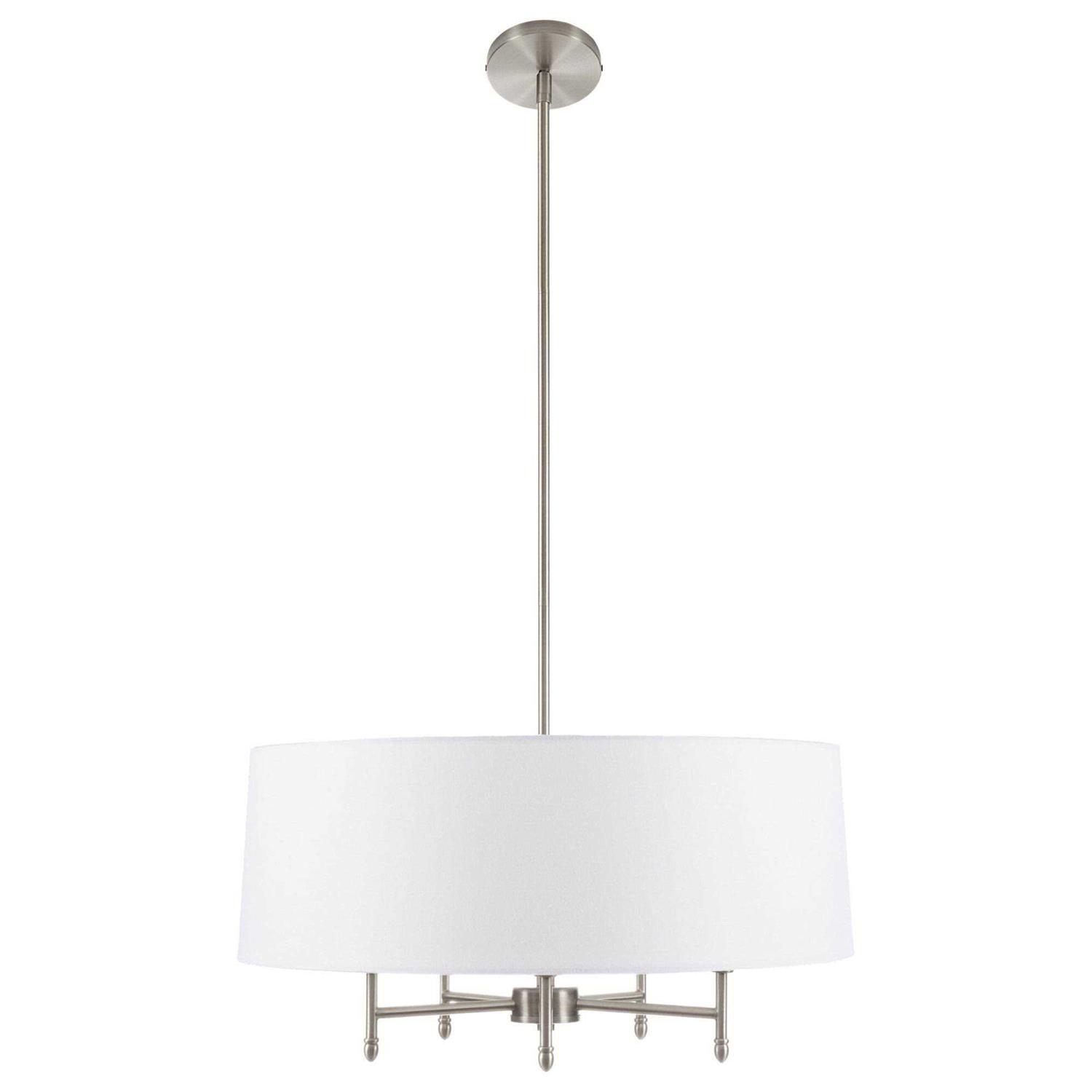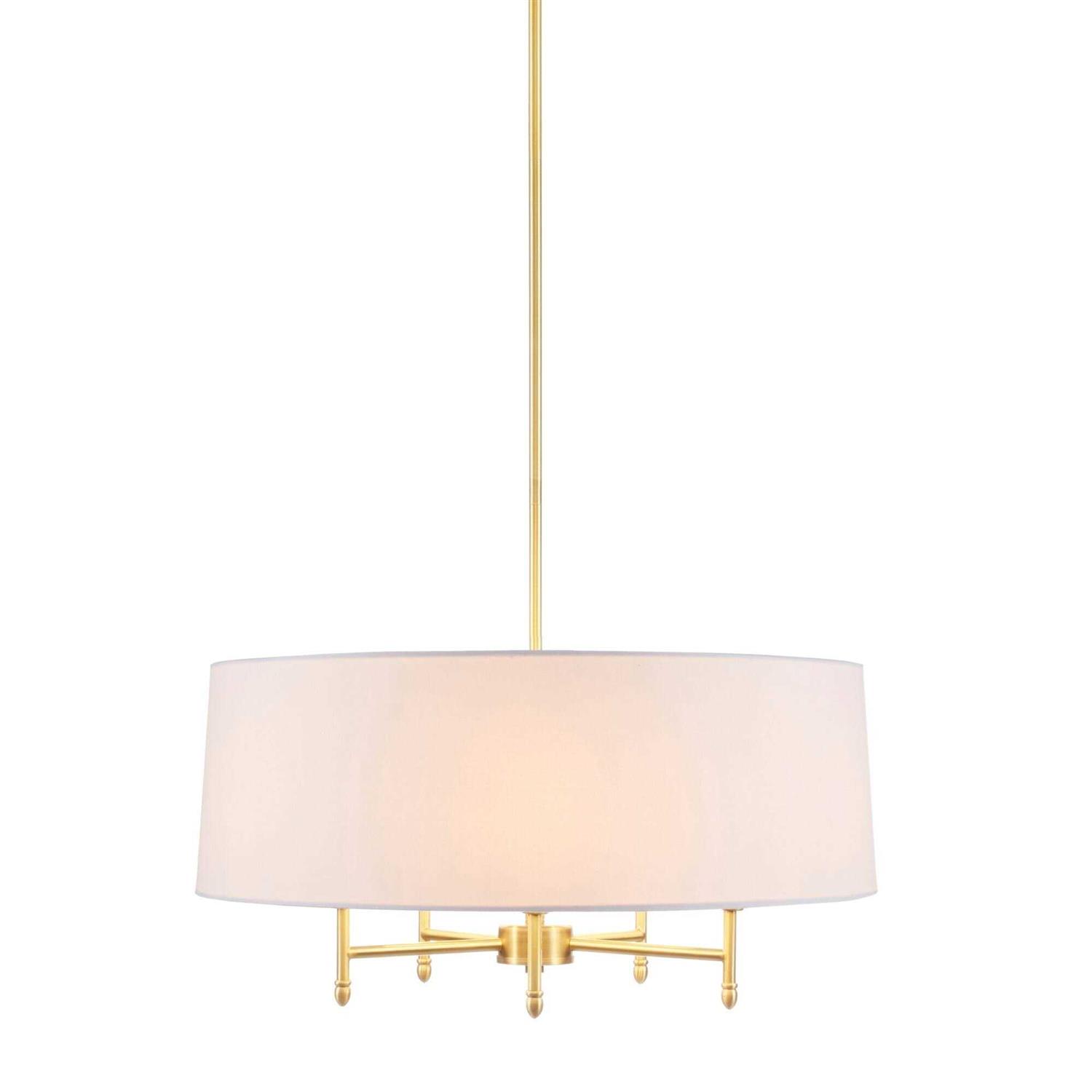 Introduce a gorgeous transitional look to your decor with Hampton Hill’s Presidio Chandelier. Featuring a white tapered fabric shade that is able to tilt, this transitional chandelier adds a touch of elegance with the plated brass finish on the metal frame and celing cover. The ceiling drop down height is 55-inches with a 61-inch black cord to perfectly fit your space. Hardwire this chandelier to your ceiling, but not on a sloped ceiling to create a stunning display to illuminate your kitchen or living room. Five Type-B 40-watt incandescent bulbs or five 9-watt CFL light bulbs are needed. Mounting hardware and professional installation is required.
