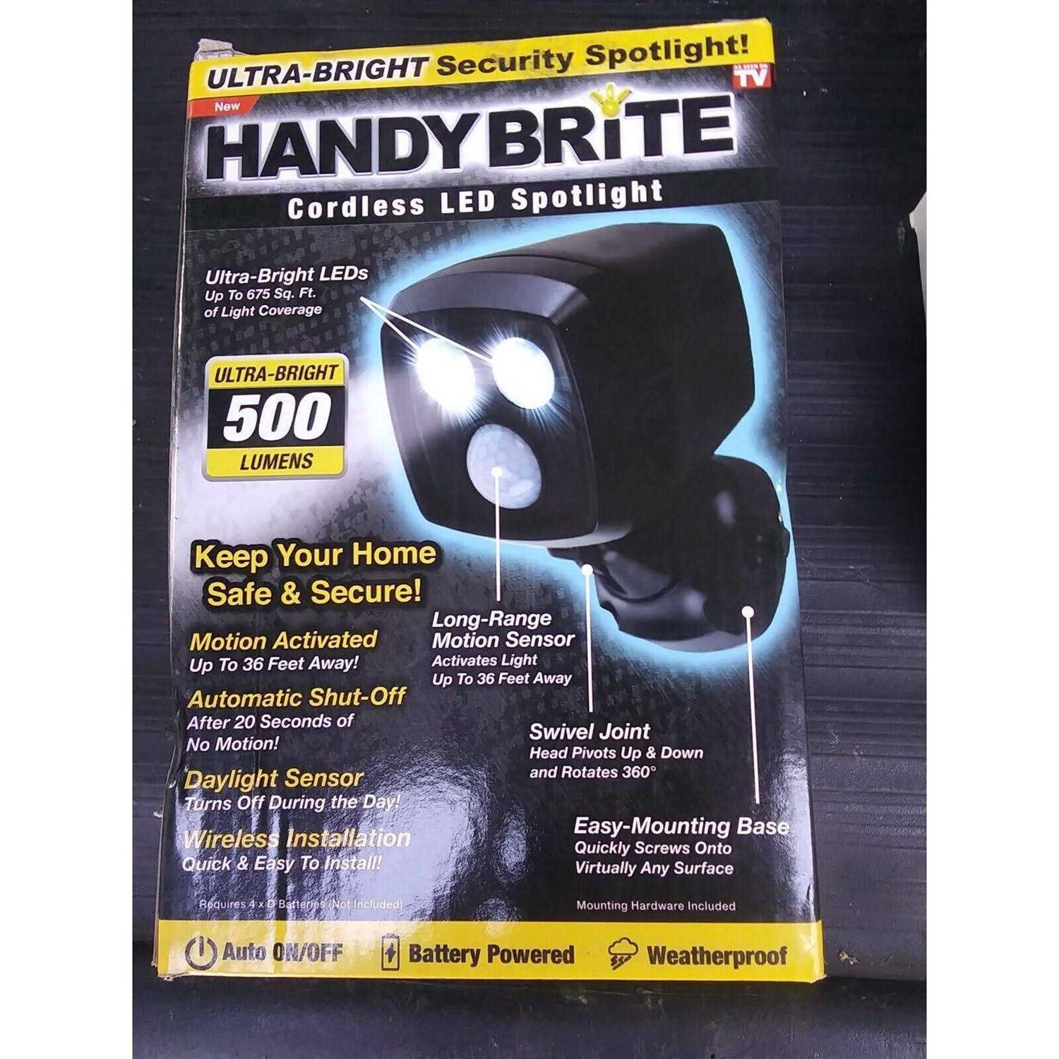 This automatic light increases safety! Super-bright motion-activated outdoor light activates from up to 30 ft. away and conveniently shuts off after 20 seconds. Adjustable head rotates 360 degrees, directing the powerful 500-Lumen LEDs exactly where you need them. The wireless design of this Handy Brite Motion Spotlight installs in minutes with included hardware. Weatherproof motion-activated security light allows for convenient indoor and outdoor use. Requires 4 D batteries (not included).