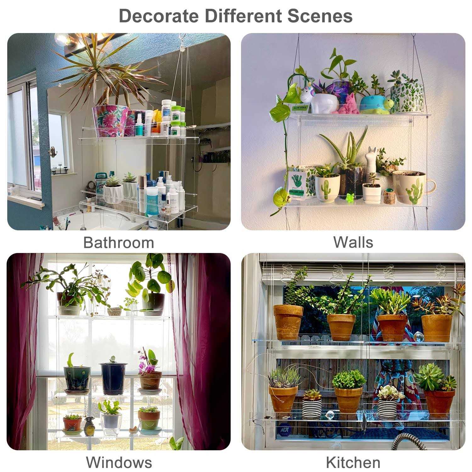 HIGH QUALITY & MODERN DECOR DESIGN – Clear shelves, made of non-yellowing high quality 3.0mm acrylic modern transparent design, bring you with a touch of refreshing contemporary sense and help to keep the original color of your plants. Transparent plant wall shelves appear to take up little or no visual space. SUPER CLEAR ACRYLIC SHELVES – The 3-tier hanging shelves are perfectly crystal clear AFTER the protective film is removed, and it does not restrict light shining in on a room either. Very clean looking and looks like a greenhouse window. It still allows you to easily see outside while doing dishes and cleaning up the kitchen. ADJUST HEIGHT FREELY – Size:16”Long, 6″ Wide, 1″ Deep. Layer Cable is 59”. The hanging window shelves could hold about 3-5 small flower pots each tier nicely. You can easily adjust the spacing by pressing the locking turnbuckles to obtain the best fit for windows and plant growth. EASY TO ASSEMBLE – All the parts, step-by-step instructions and hardware were included, please assemble according to the manual. All of the acrylic pieces are protected with a layer of protective film( avoid scratching during transportation). Please remember to peel the protective film off before use. MULTIPLE PLACES FITTING – The acrylic window shelves are perfect for displaying plants,flowers,perfume,crystal in living room,bedroom.They can also used as bathroom storage shelves and kitchen window decor. Our acrylic wall shelf is the ideal housewarming gift for your friends and family. The window plant pots organizer is not only a great shelf to save space and keep plants away from cat but in the sunlight. Also you have a place to grow fresh herbs,veggie,mint,african violet seedlings etc.