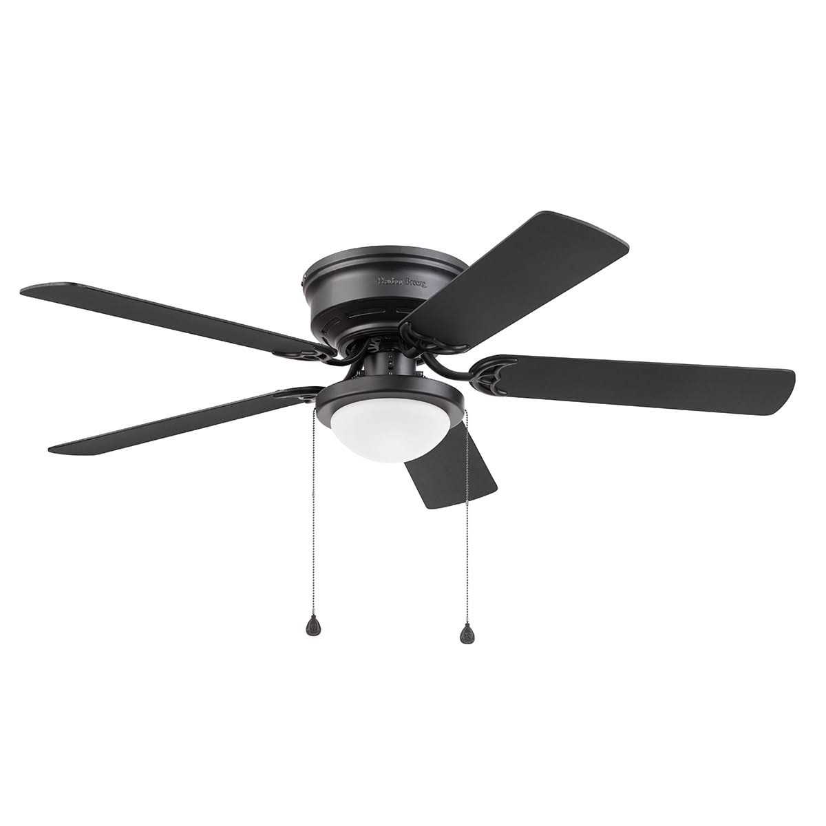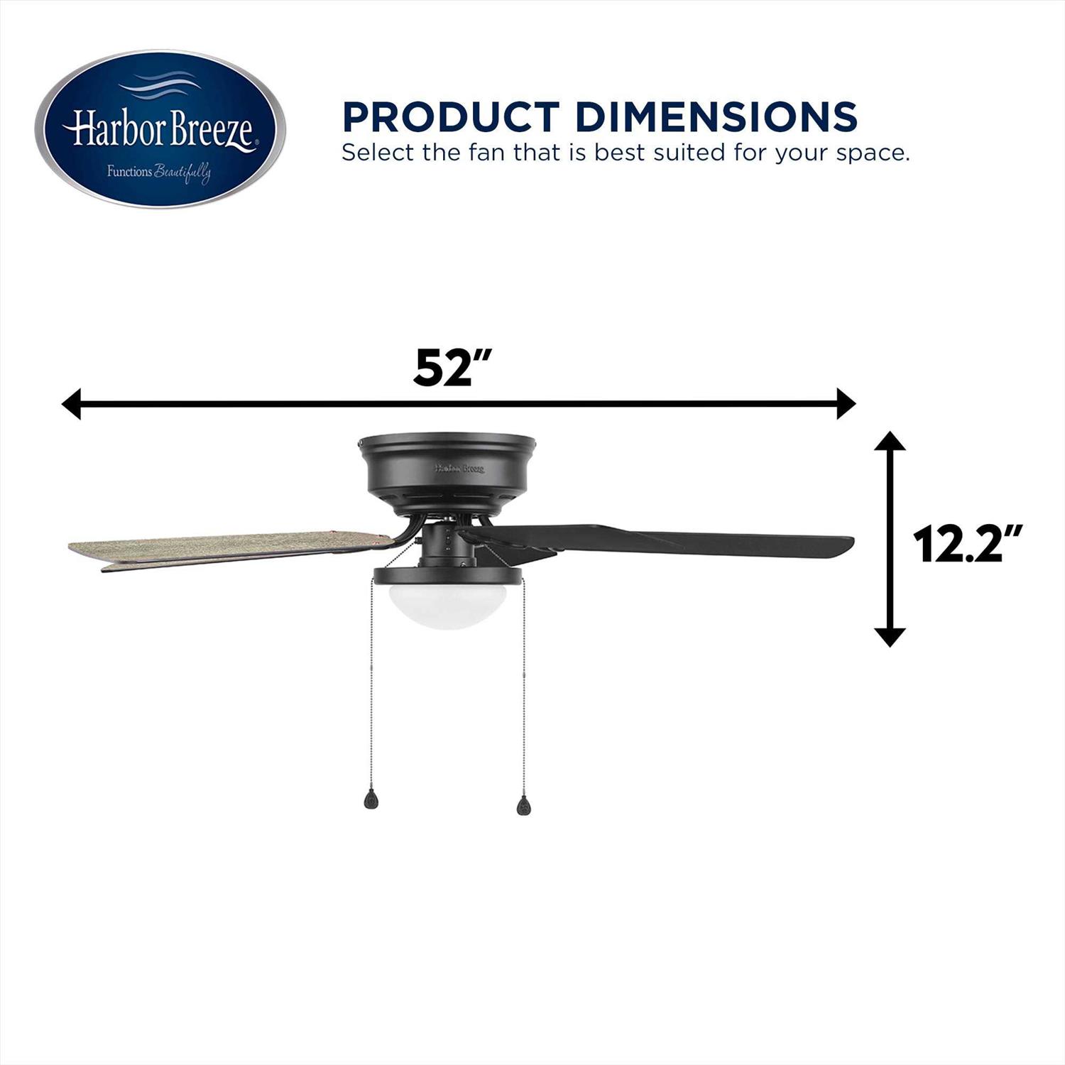 The Harbor Breeze builders series 52-in Armitage ceiling fan features a matte black finish, 5 reversible blades and light kit that includes an LED bulb.