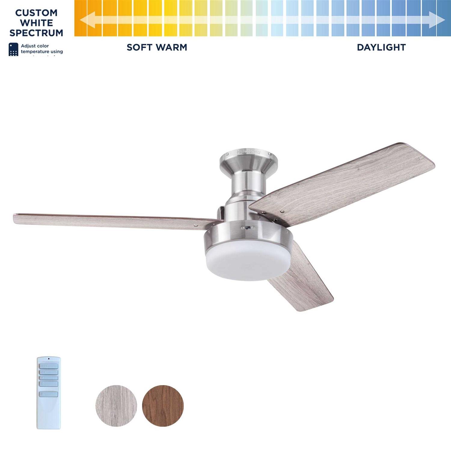 Custom White Spectrum technology features light color ranging from a warm white light to a bright white light. Adjust light between activities or by time of day- wake up with natural light, focus with bright white and wind down with a warm glow. Easily control the 3 speed settings, light output and color using the handheld remote included with the ceiling fan. Frosted glass houses integrated LED board with Custom White Spectrum technology featuring light color ranging from a warm white light (2200K), like a candlelight glow, to a bright white light, simulating daylight (6500K). With a blade span of 52 inches and airflow up to 4626 CFM, this indoor fan is perfect for medium to large sized rooms. Low profile design to be mounted flush with the ceiling where more walk-through space is required. Brushed nickel finish ceiling fan from the Mac collection features 3 reversible driftwood/toffee blades so you can choose the right look for your home. Quiet, reversible motor efficiently circulates cool air in the summer and warm air in the winter, cutting down on energy costs.