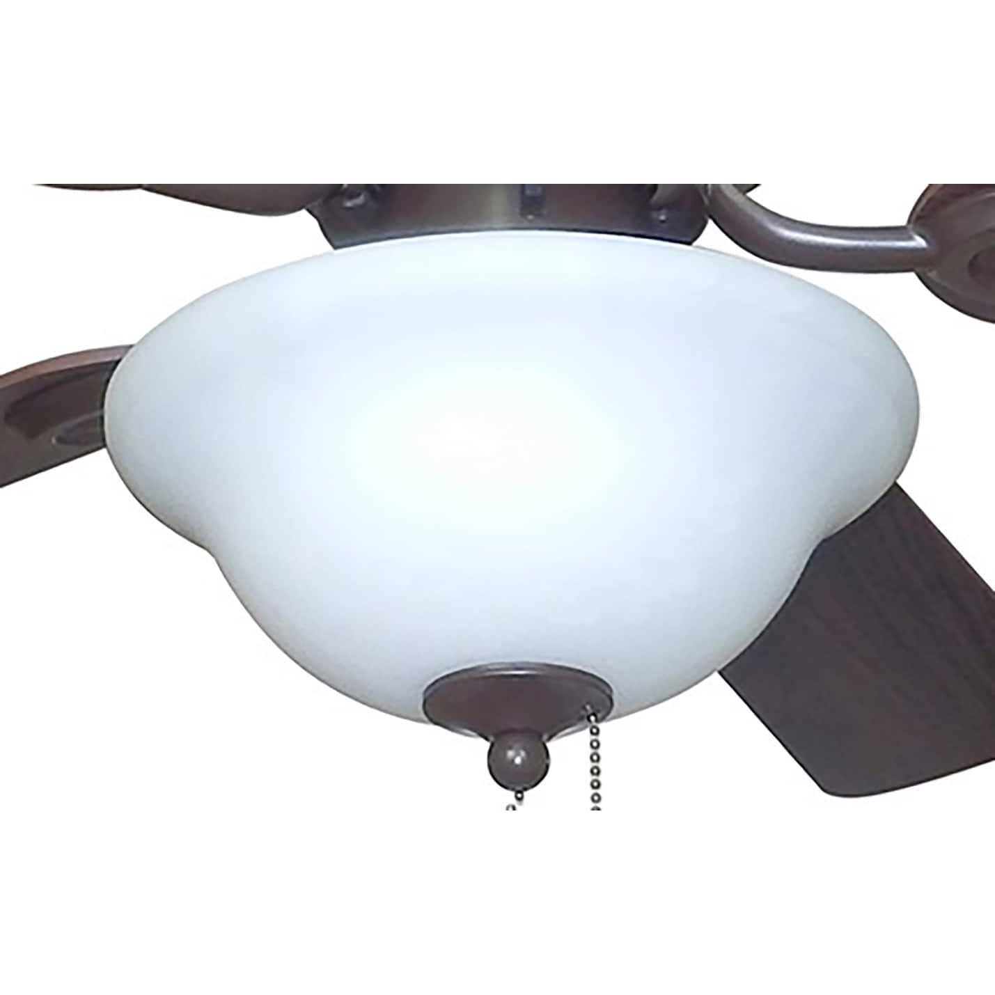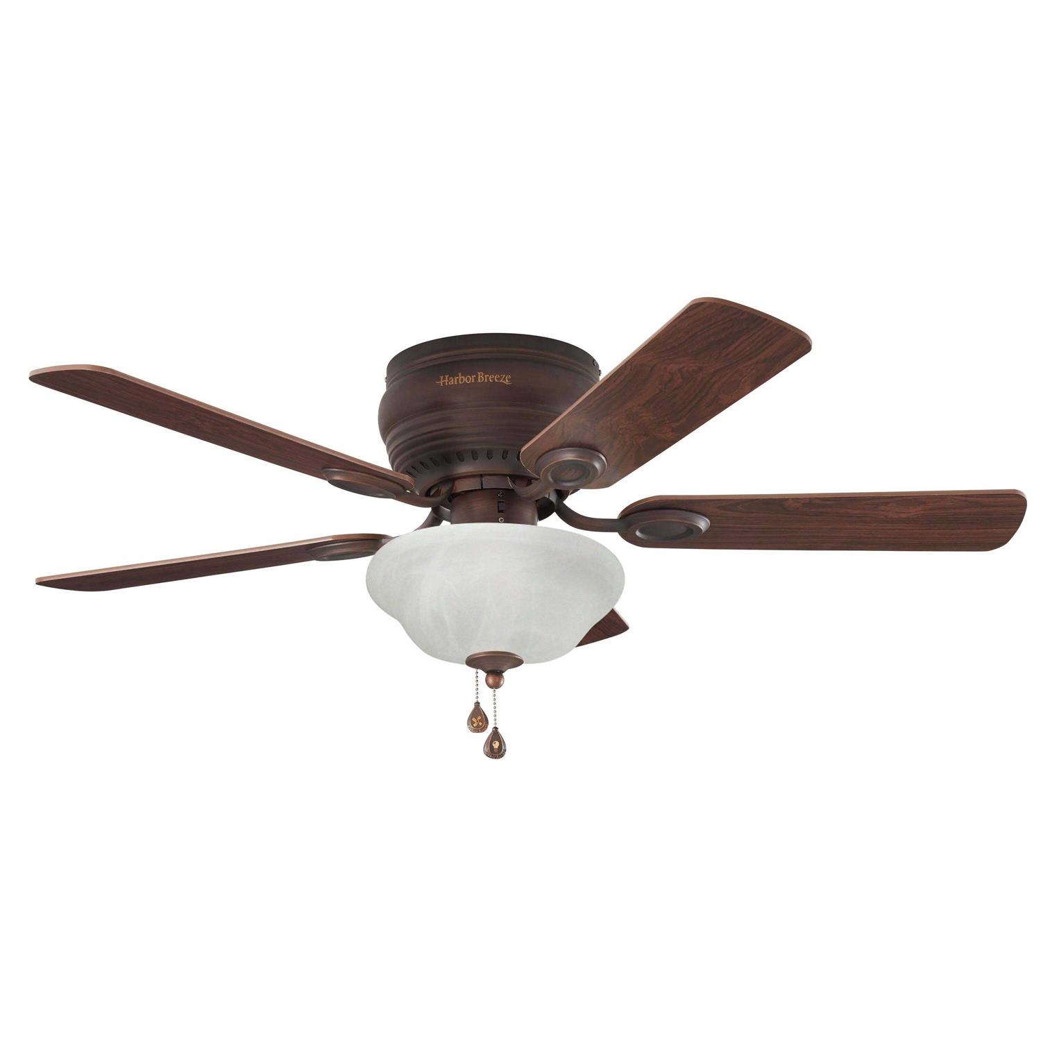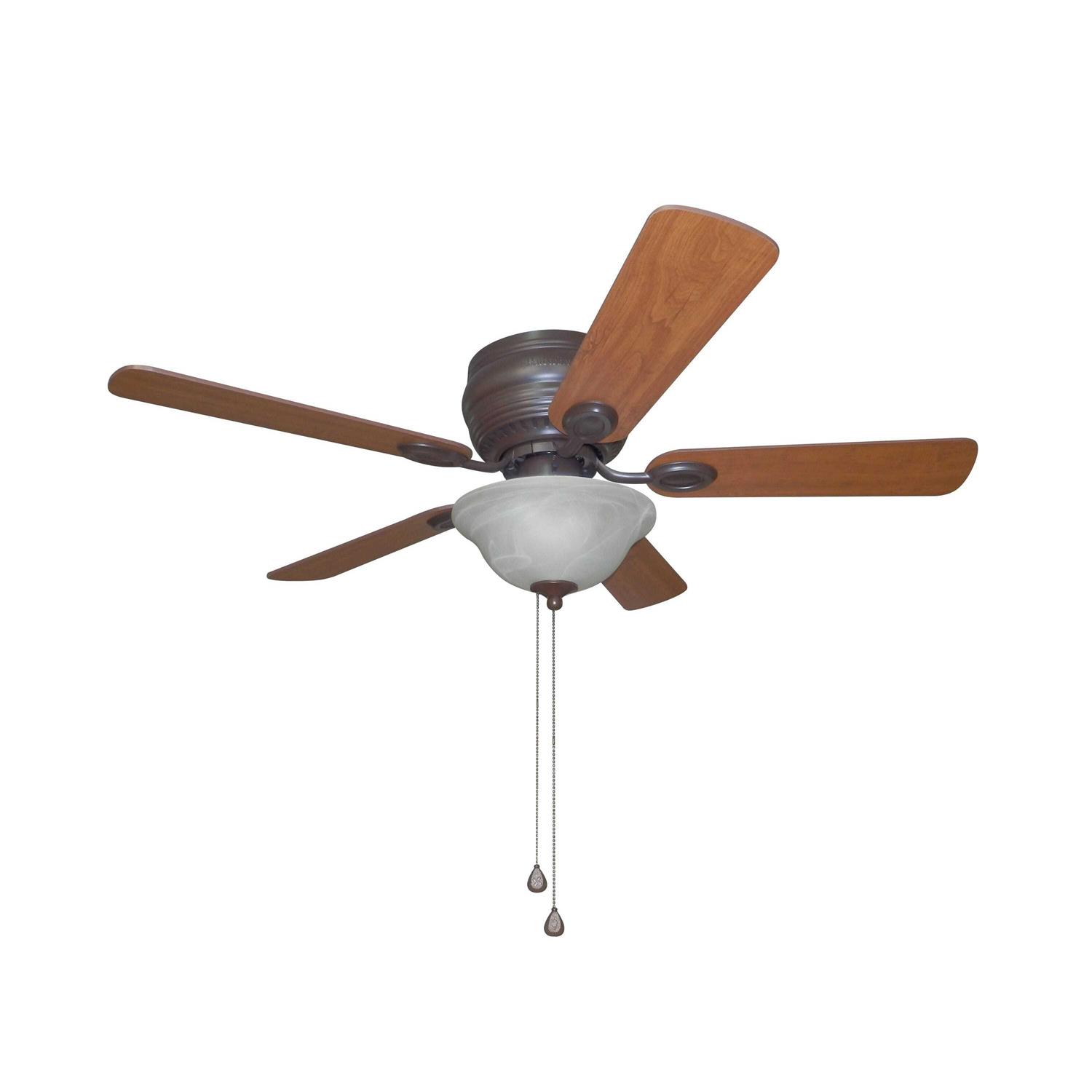 Bronze finish ceiling fan from the Mayfield collection features 5 reversible blades in a cherryteak finish. Alabaster glass light kit offers attractive energy-efficient illumination LED bulbs included. 44-in fan provides enough airflow for small rooms up to 100-sq ft. 3 speed settings make it easy to maintain your ideal comfort level. Pull chains make it easy to change fan speed and light settings. Reverse air flow feature allows you to change the direction of the fan according to the season. Flush mount installation is perfect for rooms with lower ceilings. Great for casual or transitional style decor.