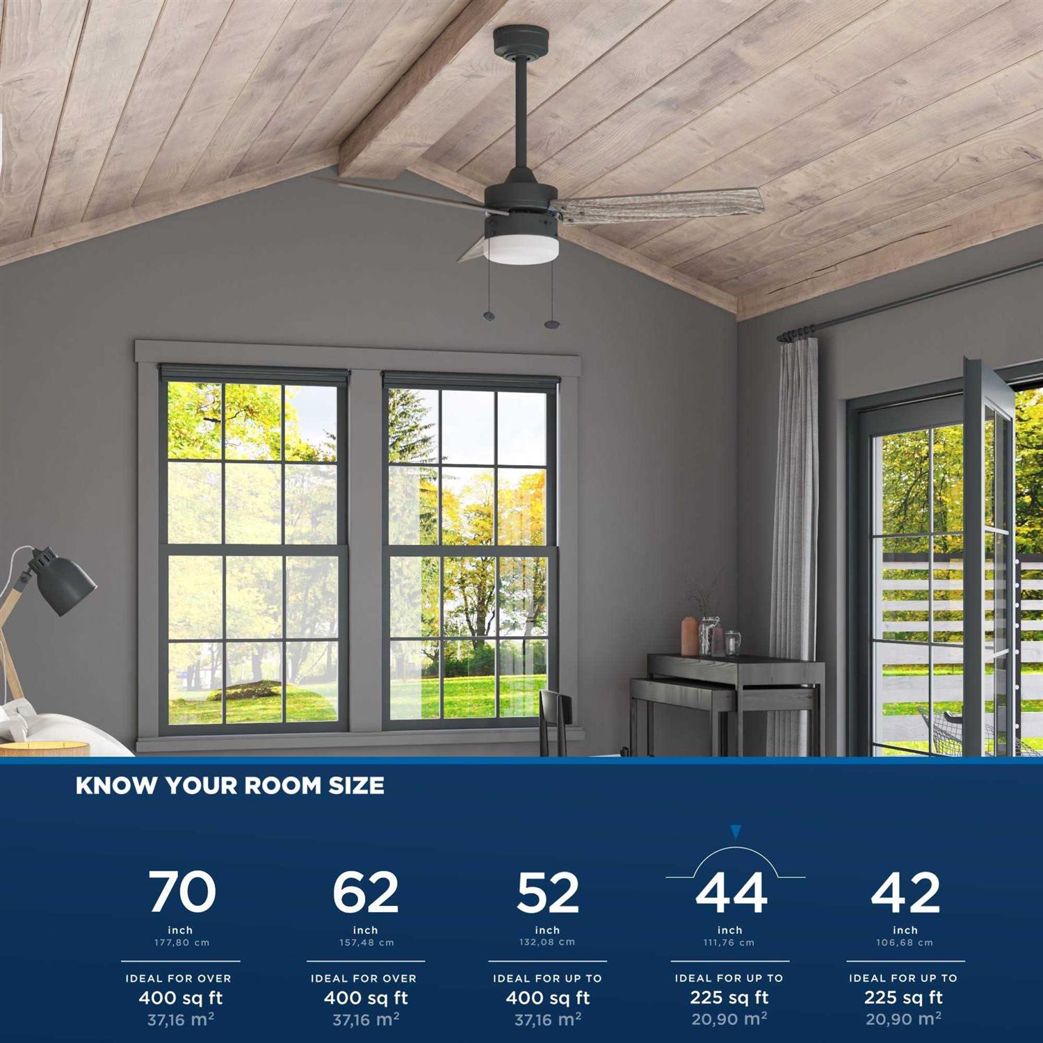 Contemporary designed 3 blade ceiling fan is 44 inches in diameter and features and integrated light kit with LED bulb included.