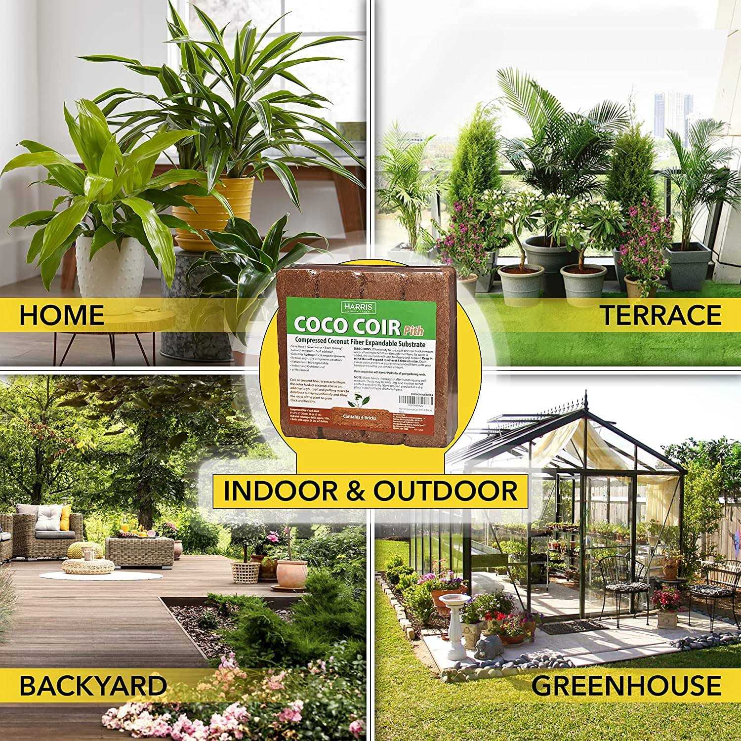 Use as an additive to soil and potting mixes for even distribution of nutrients Moisture Retention. Can absorb up to 10x its weight in water, making adequate root hydration easier than ever Improves Aeration. Adding coco coir fiber to soil allows for coir’s fluffy texture to create air pockets, making soil spongy and loose Indoor and Outdoor Use. From indoor potted plants to an outdoor garden, coir is extremely versatile Natural and Biodegradable. Great for hydroponic and organic growers Coir, or coconut fiber, is extracted from the outer husk of coconut. Product details Harris Coco Coir, or coconut fiber, is extracted from the outer husk of coconut. Always soak bricks in water prior to use. Harris Coco Coir 4 bricks yield up to 36 quarts or 9 gallons after soaking. Coco Coir is used as an additive to your soil and potting mixes to distribute nutrients uniformly and allow the roots of the plant to grow thick and healthy. The pH is balanced so its recommended for indoor and outdoor use. Always follow label instructions.