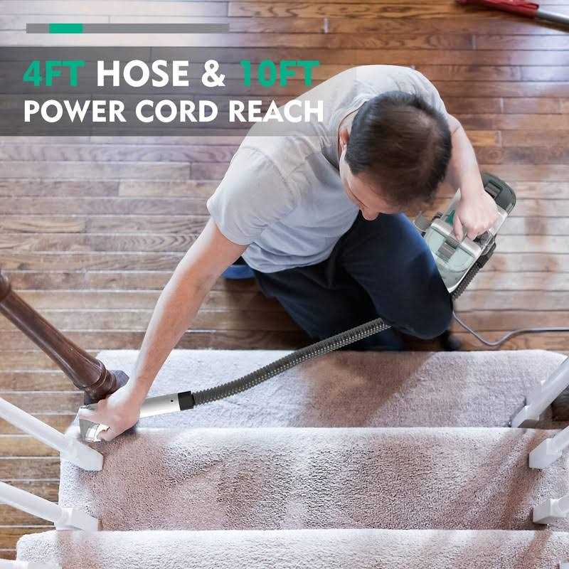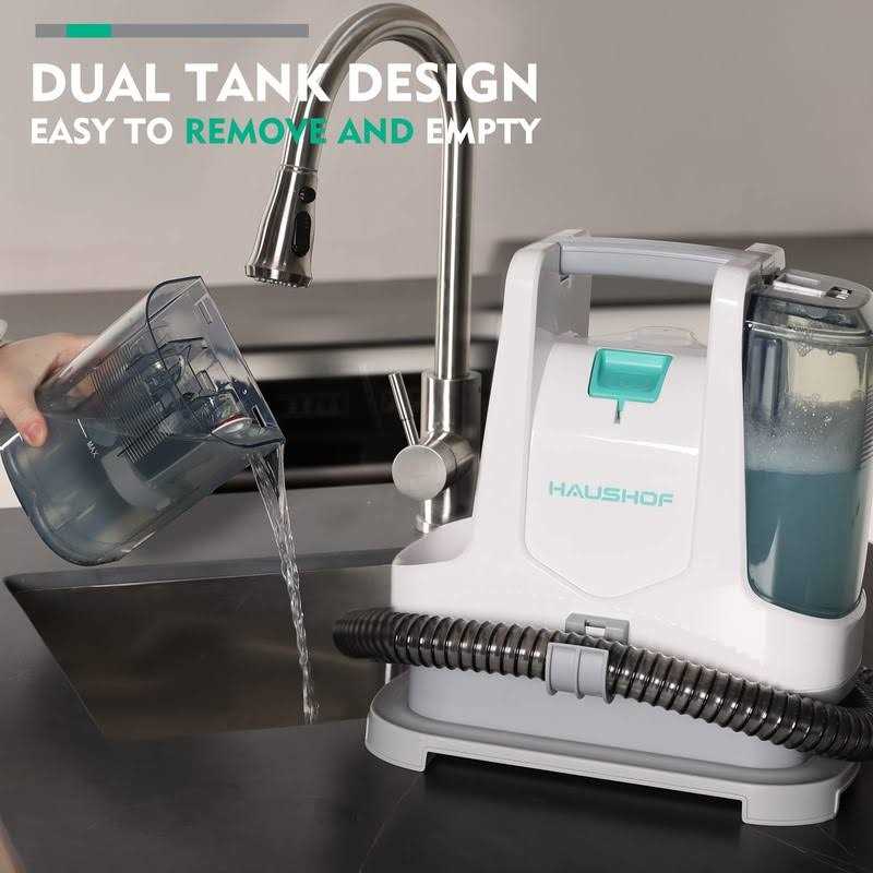 HAUSHOF Portable Carpet Spot and Upholstery Cleaner (HH22050A) – At 7.5 lbs, the HAUSHOF can be easy to carry and make it convenient to clean virtually anywhere. Simply spray, scrub and suck out dirty water to easily remove muddy paw prints from carpets. For cracks, corners, baseboards, the back of chairs and hard-to-reach areas. Separate storage for 37oz clean water and 17oz sewage tanks for easy access and empty, which is more hygienic. Reach and remove unexpected spills as quickly as with 4ft hose and 10ft power cord length.