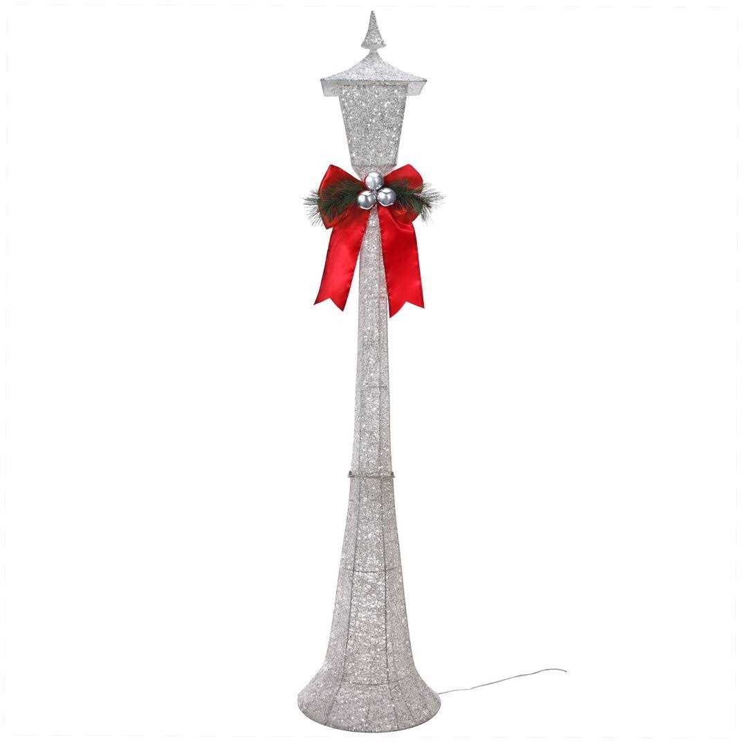 A nostalgic charming Victorian lamppost is the perfect addition to any holiday scene! Constructed of a durable white metal frame with silver sequins and glitter are lit with 50 white LED lights makes a beautiful wintery scene at night. UL-listed adapter. Ground stakes are included. Suited for Indoor and outdoor use. Measures 48” tall.