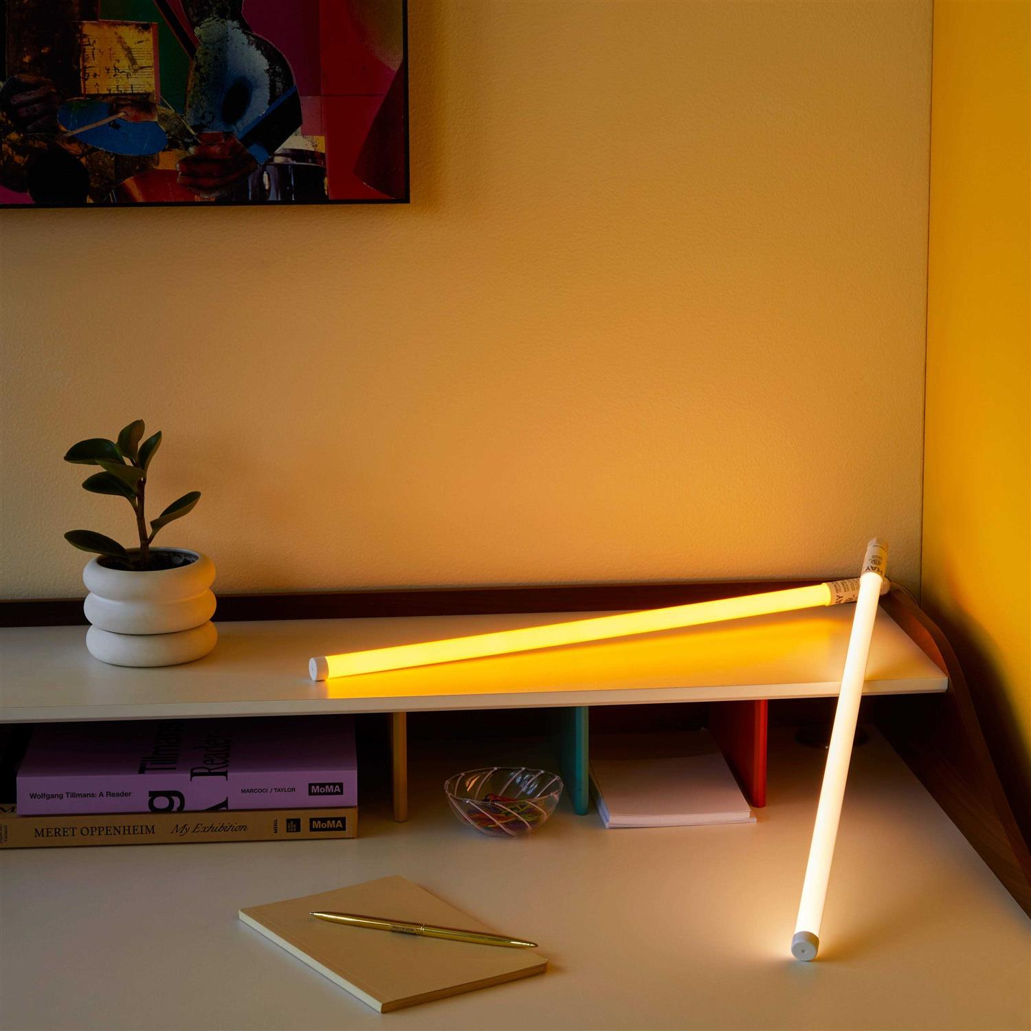 Illuminate the whole room and provide it with a unique atmosphere with the intense colors that comes with Hay Neon Tube LED Slim. The wide range of bright and beautiful colors of Blue, Pink, Yellow, and Warm White can be used separately or as a multiple light installation. LED Slim Hay Neon Tube is also available in either 50cm for the Small Size or 120cm for the Large Size. The industrial appearance of LED Slim Neon Tube by Hay gives it a studio motivated décor, while its additional slim design gives it additional discreet and stylish look. With Neon Tube LED Slim Hay, you will be rid of tiring bulbs to bring a modern streak to your workspaces and studios. LED Slim Neon Hay Tube makes a great choice to the classic pendants and lampshades as it boasts a thin, cylindrical silhouette that gives off a fluorescent glow. Stand Neon Tube LED Slim by Hay alone in a bedroom, corner of a music studio or office, or mix it with other colors as a attention-grabbing light installation. The casing of Neon Tube LED Slim has been created from a combination of resilient PVC and polycarbonate, while it is anchored by a plastic base which interfaces with a 200cm long cable. The Neon Tube LED Slim comes with a non replaceable single 12W LED bulb.