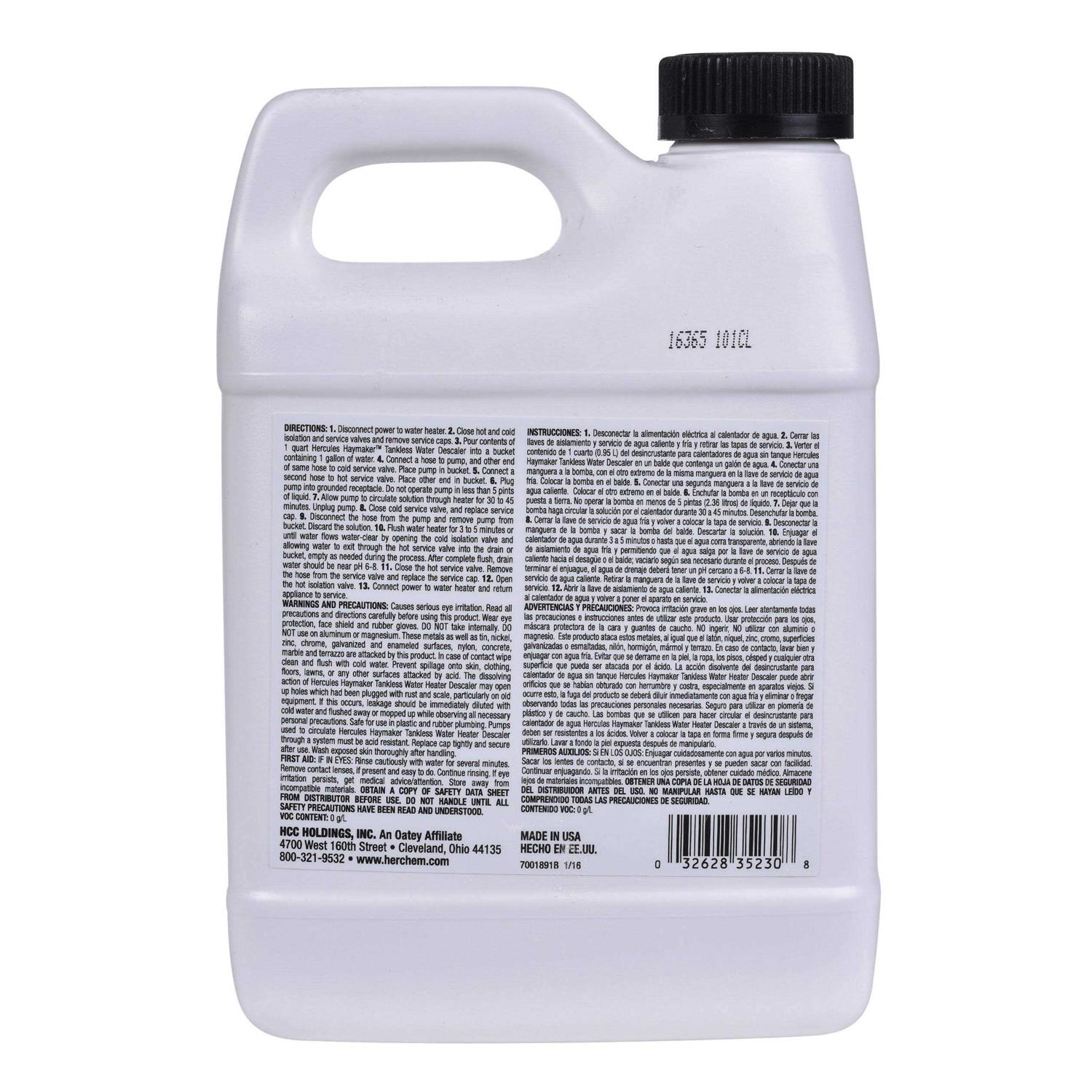 Restore Flow Efficiency Hercules Haymaker breaks down scale build up that can deter flow efficiency and jeopardize the life of your tankless water heater. Haymaker allows you to restore your water heater in just a few simple steps without having to call a plumber. Safe Solution The Hercules Haymaker descaler is a citric acid-based, solvent-free formula that is compatible with most metals, rubber, steel, PVC, CPVC, and ABS materials. Haymaker is biodegradable, non-corrosive, and safe for potable water systems.