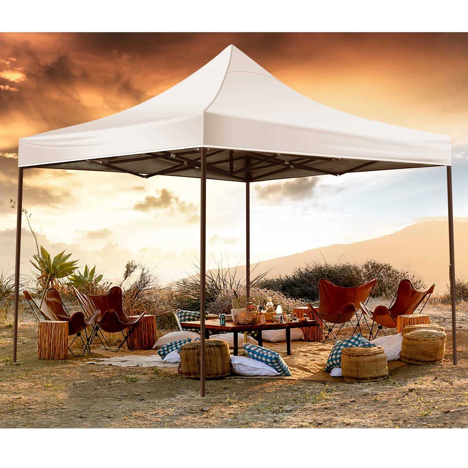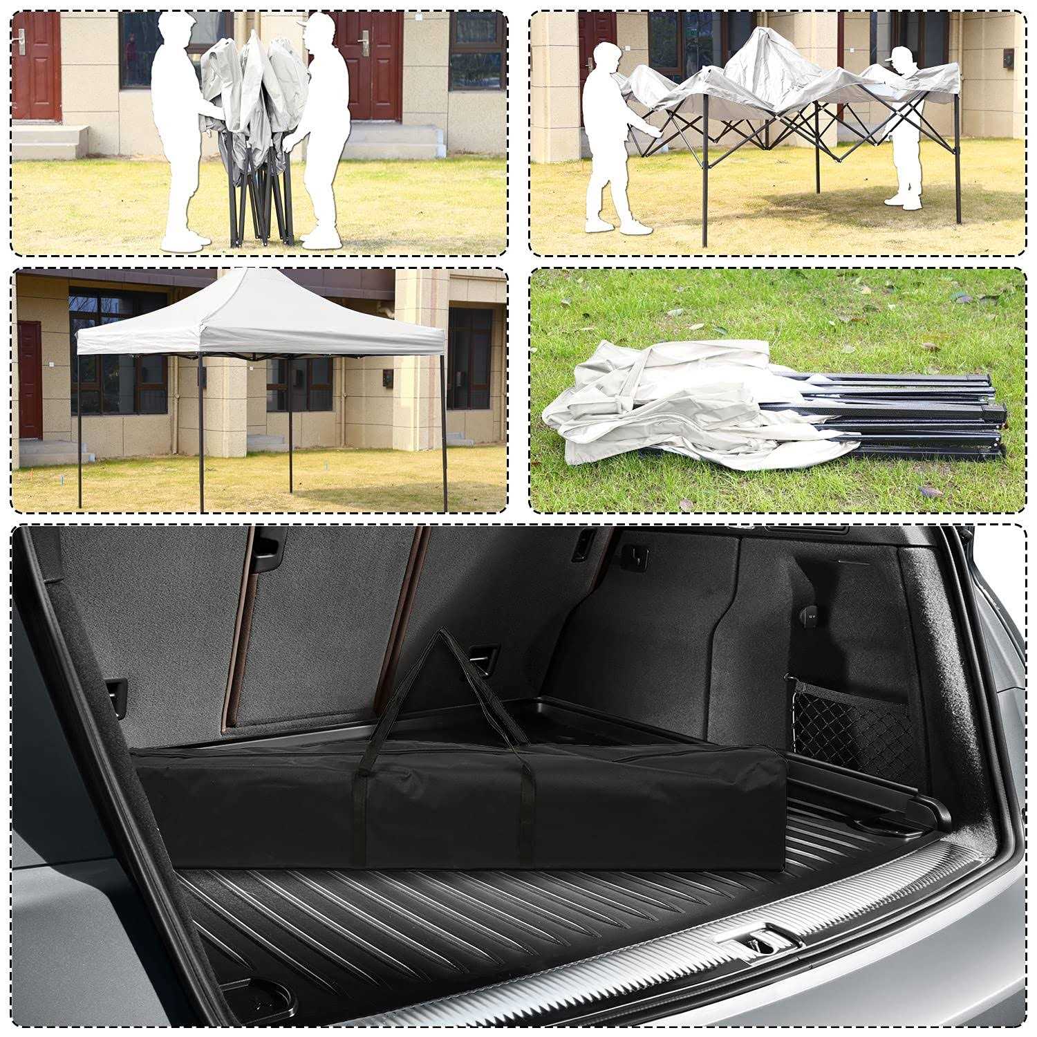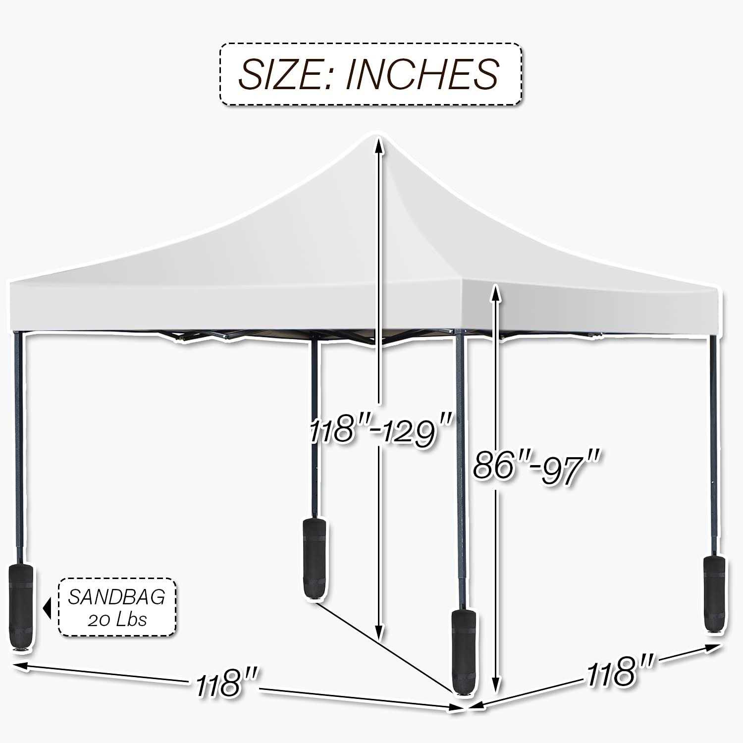 【One-Minute Set-Up Canopy Tent】 1. Take the fully assembled frame with the top out of the bag and pull it open. 2. Place the fabrics over the frame and extend the legs. 3. Use the thumb press buttons to easily adjust the height and then snap into place. Quick and simple. 【Upgraded Fabric】 Pop up canopy with the improved fabric is UV coated to reflect 99% of harmful sun rays and water-resistant. The instant canopy with the 420D Oxford Waterproof silver coating top is easily removed. 【More Room Designed Portable Canopy】 10 x 10 popup tent (118 x 118 x 129 inches)with the adjustable lower legs can adjust the canopy’s angle&height to maximize shade throughout the day. The leg design expanded the space. People under the canopy can enjoy more room than a normal tent. 【Convenient, Durable, and Sun Protaction】(1)Take this portable canopy tent anywhere with the carrying bag, which fits into most car trunks. (2)The spiral interface between the tubes makes the overall frame more stable. The high-grade steel frame is powder-coated preventing chipping, peeling, rust, and corrosion. Perfect for outdoor events, camping, picnics, and sporting events. 【More Accessories and Parts Includes】 In addition to the regular configuration, HCB bonus 4 weight bags, steel stakes, and ropes. The lightweight materials are used to achieve portability. This portable beach canopy can provide a safe and stable area.