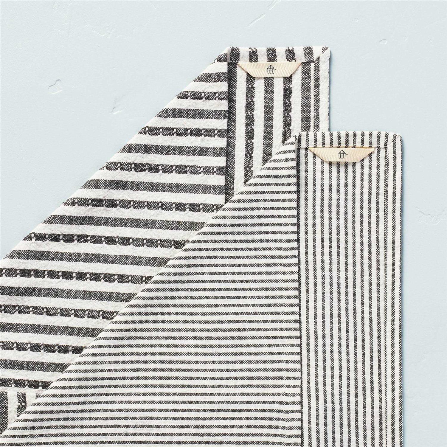 Pick up a must-have kitchen essential with this 2-Count Ticking Stripe Kitchen Towel Set from Hearth and Hand with Magnolia. This pack includes two kitchen towels featuring a dark gray ticking stripe pattern on a cream backdrop to add classic style to your kitchen decor. Made from soft and absorbent cotton-linen fabric, these kitchen towels make just the right pick for drying dishes and hands, and they can be machine washed for easy care. Wide stripe towel = 84percent Cotton, 14percent Linen, 2percent Other Fibers Thin stripe towel = 90percent Cotton, 9percent Linen, 1percent Other Fibers Hearth and Hand with Magnolia: Gather ∙ Create ∙ Enjoy Color: One Color.