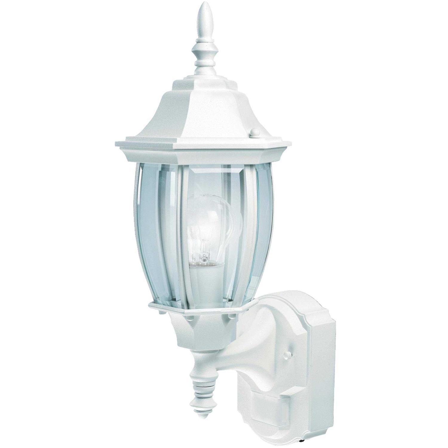 Durable Die Cast Metal Coach Lantern features 180 degree motion detection up to 30 feet away. The lantern has curved beveled glass and is with a weather resistant finish. Uses 1 A19 bulb/E26 base (100 watt maximum), incandescent, LED, or fluorescent. Features DualBrite 2-level lighting for energy efficient accent lighting or full bright security lighting.