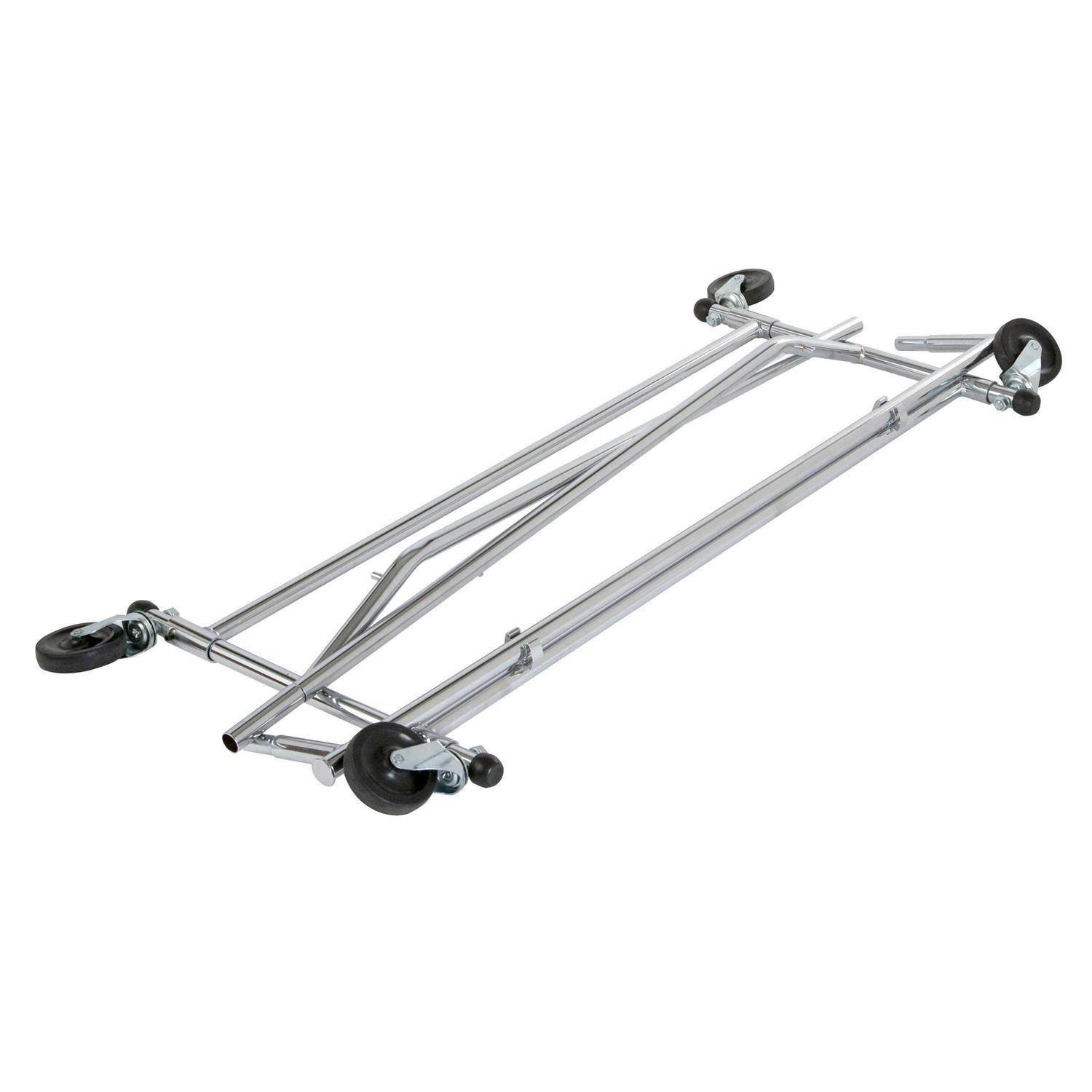 Econocos rolling collapsable clothing rack is the perfect addition for your clothing store display! This collapsable rolling rack has a chrome finish making it stylish while remaining incredibly durable. Made of steel, the collapsable rolling rack is adjustable in height from 54″ to 65″. The clothing rack commercial grade is designed for easy mobility, even when it is filled to capacity. Also, it is easy to store while not in use. The rolling rack commercial grade requires no assembly which allows you to use it immediately. The collapsable clothes rack comes with wheels making it easy to move around. Along with its easy assembly, the rolling rack has 4 industrial casters. The rolling rack is incredibly sturdy and will hold a large load making it perfect for display or for storage purposes. This rolling collapsable rack is ideal for all of your storage needs.