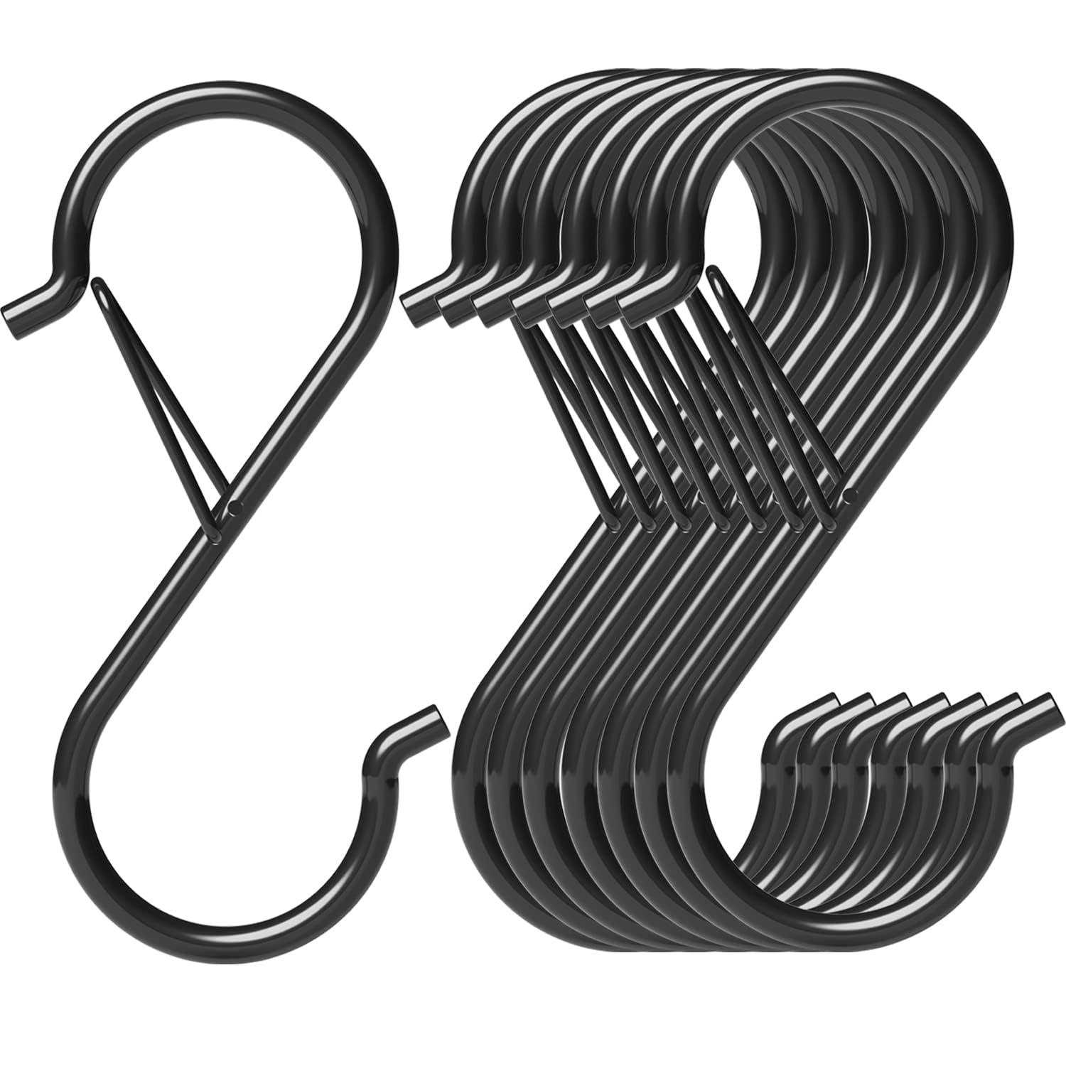 Safety Buckle Design: The unique locking clip design helps the hook not fall accidentally, making it more comfortable and convenient for you to use. High Quality Materials: The product is made of high quality metal with Vinyl coated hook for long service life. The hook has a smooth surface and won’t scratch your hands or damage your items. Utility hook: Heavy-duty S-shaped hook is 3.5 inches long (it’s a little longer than a credit card, about 8.9cm long), opening 0.9 inches, opening diameter of the locking side of the hook is 0.47 inches, Please do not use it with a half inch diameter tension rod. Before purchasing, please measure the diameter of the locking sidebar. EASY TO USE: Both sides can be used to hang items to meet your different needs. You can use the S hook to hang pots and pans, plants, clothes, bags on a shelf, pole or shelf. Can also be used in closets, bathrooms, gardens. Features: Our heavy-duty S-shaped hook is designed with a safety closure on the basis of the original black coating metal S hook, which greatly improves the safety of hanging objects, so that the hook can be firmly hung on the pole. It can be used to hang anything in kitchens, closets, bathrooms, gardens, workshops or garages where space is limited. Perfect for indoor and outdoor use.