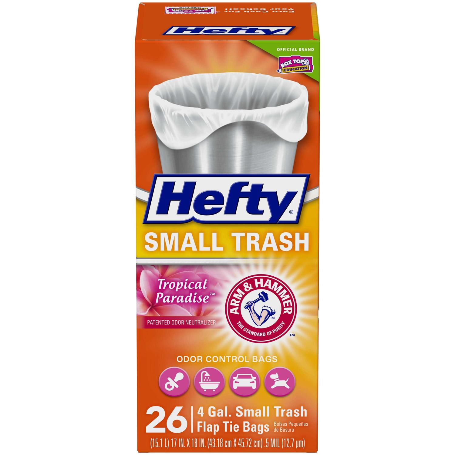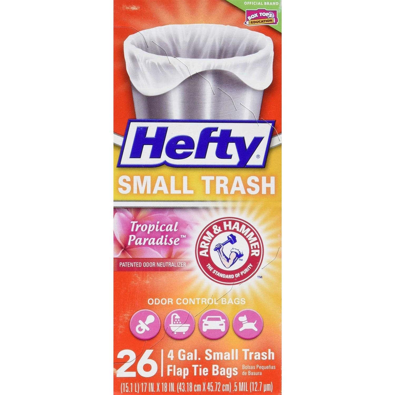 Manage trash in your nursery, office, bathroom, car, and more using small garbage bags from Hefty – the only small bags with odor control. All Hefty small bags are perfectly sized for small trash cans, and the scented varieties feature Arm & Hammer odor neutralizing agents that control odors inside the bag and keep smells from getting into your home. Convenient flap ties help keep trash in the can and off the floor when removing and closing the bag. Every package includes one Box Top to help you earn cash for your school. Package contains 26 white, 4-gallon small trash bags with Tropical Paradise scent.