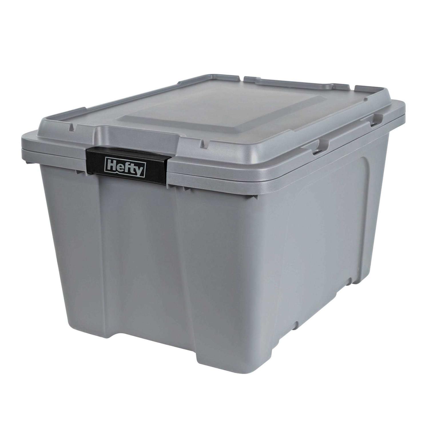 The Hefty 18-Gallon MAX PRO Storage Tote is a perfect storage solution to save space in your home. This rugged, durable container is great for camping and outdoor gear—perfect for garage organization and basement organization. Use these plastic containers for attic storage, shelf storage, and to organize seasonal items such as outdoor decorations and utility tools. The totes are also good for sports equipment storage–the secure stacking and above the rim storage features make this storage tote an ideal storage solution. These plastic containers are also easy to transport in a trunk or a truck bed–be sure to follow all manufacturer’s instructions to safely secure the tote to the proper hitch assembly.Multi-Use FlexibilityHefty 18-gallon MAX PRO totes are an ideal all-purpose storage solution, great for long-term storage of large or bulky items–or simply to help create additional space. The durable construction allows you to stack them on top of one another–so they can truly be the clutter-busting solution you need. The storage tote is the perfect companion for your next adventure. Everything you need for your next trip is right at your fingertips. Whether you’re camping in the woods or spending a day at the beach, this storage tote is ideal for you. A rugged design and smart storage features ensure that everything from camp chairs to fishing nets can be easily stored away and doesn’t get damaged or wet. Get organized, get inspired, and get moving with the Hefty MAX Storage Bin. Dimensions are 23.47’L x 18.3’W x 14.5”H and it’s designed to fit perfectly on a garage or basement shelf.