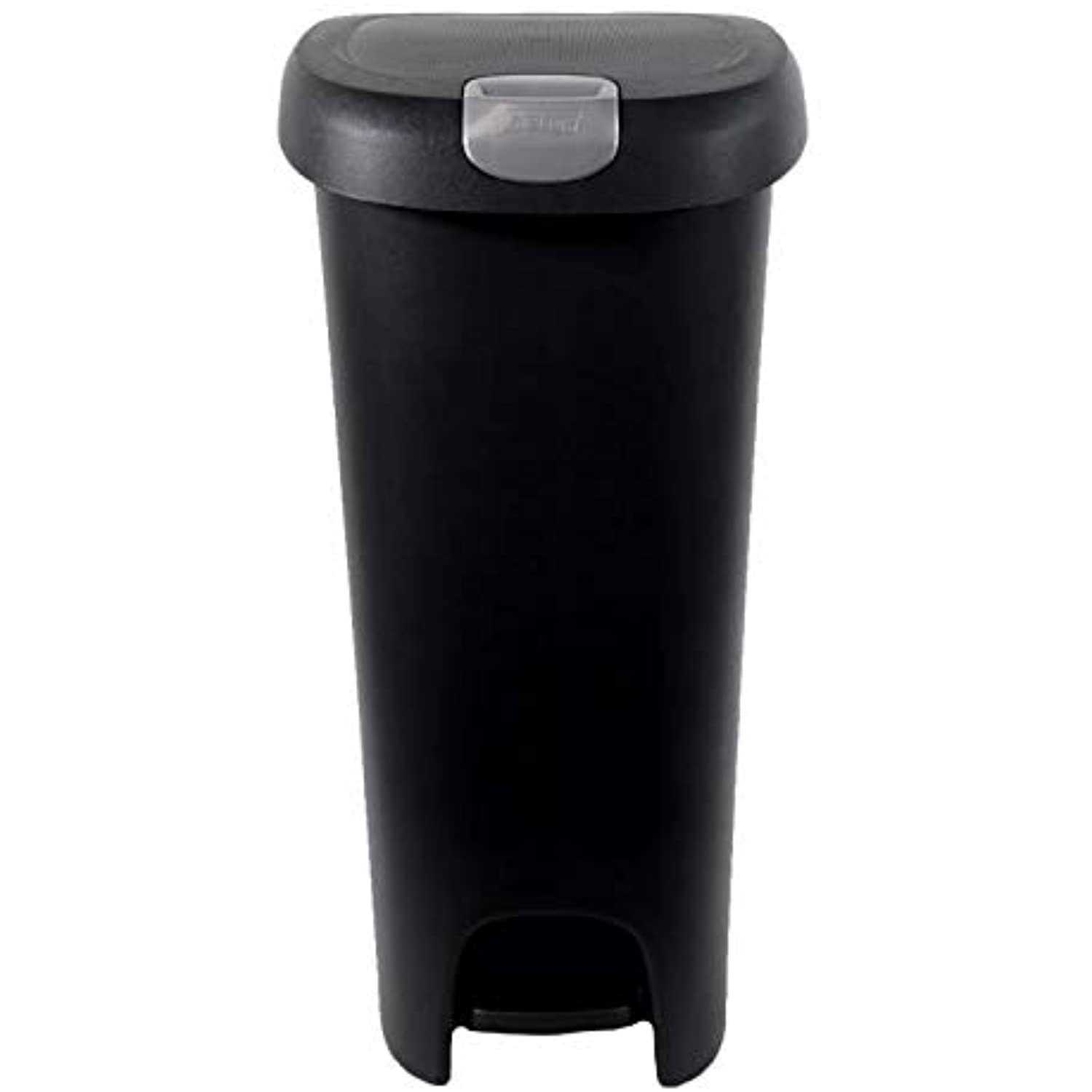 Step On trash can helps maximize kitchen, office, bathroom or any indoor space with its unique slim shape. Complete with lid locking technology, the step on trash can presents a modern, classic look while offering a durable plastic material. Pet proof can keeps critters away and assists in keeping small children safe! Dimensions:12.2 In. W x 24.31 In. H. x 18.11 In. D.