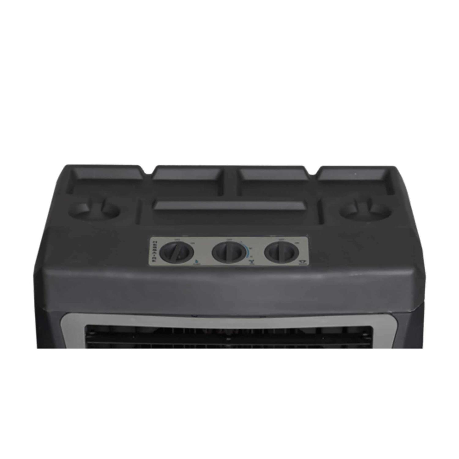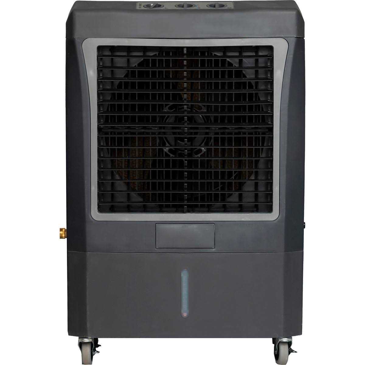 Keep the air around you cool inside and outside your home. With the Hessaire Portable Evaporative Cooler Humidifier you can stay cool inside your home out on your patio or at your campsite. Just plug it in and you’re ready to chill. This portable air cooling system cools warm stale air with natural evaporation. As the water inside the evaporative cooler evaporates into the air circulating through the cooling system the air lowers in temperature. 3 simple rotary controls allow the fan to be on high medium or low pump and oscillation motor can be controlled independently. This Hessaire indoor and outdoor humidifier has a 10.3-gallon water tank capacity that has a garden hose hook-up with a float valve for a continuous water fill. 3-sided firm high-density cooling pads increase evaporative surface area generating cooler air. This evaporative wet air cooler is ideal for areas with low humidity since water must be able to evaporate easily. This Hessaire Indoor/Outdoor Cooler Humidifier moves where you need it thanks to its lightweight design heavy-duty wheels and convenient handle.