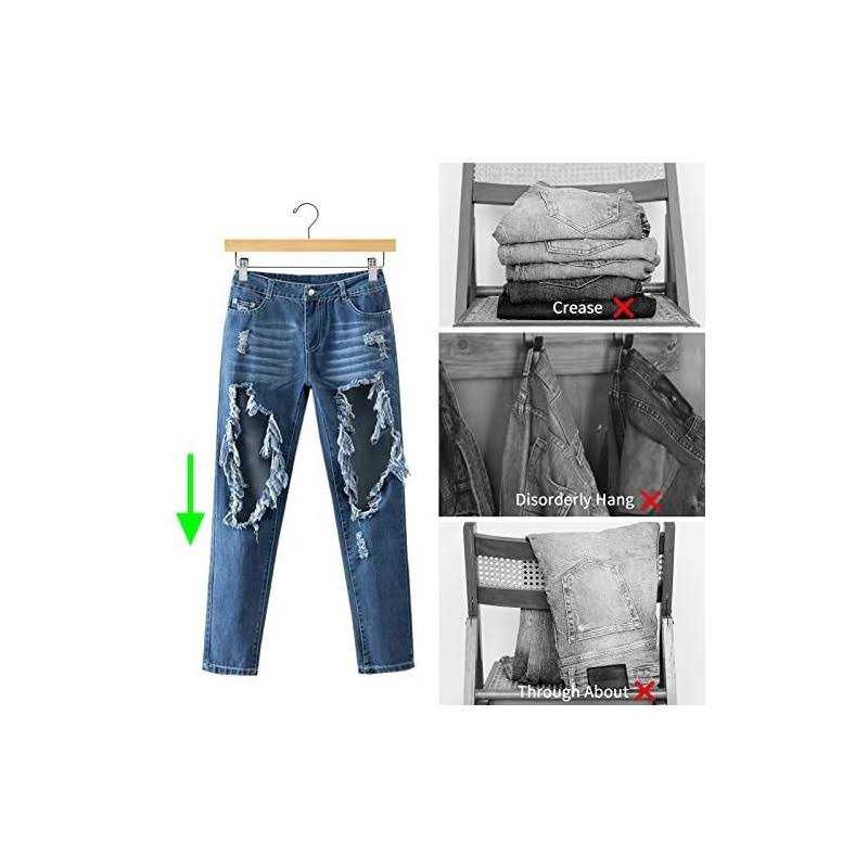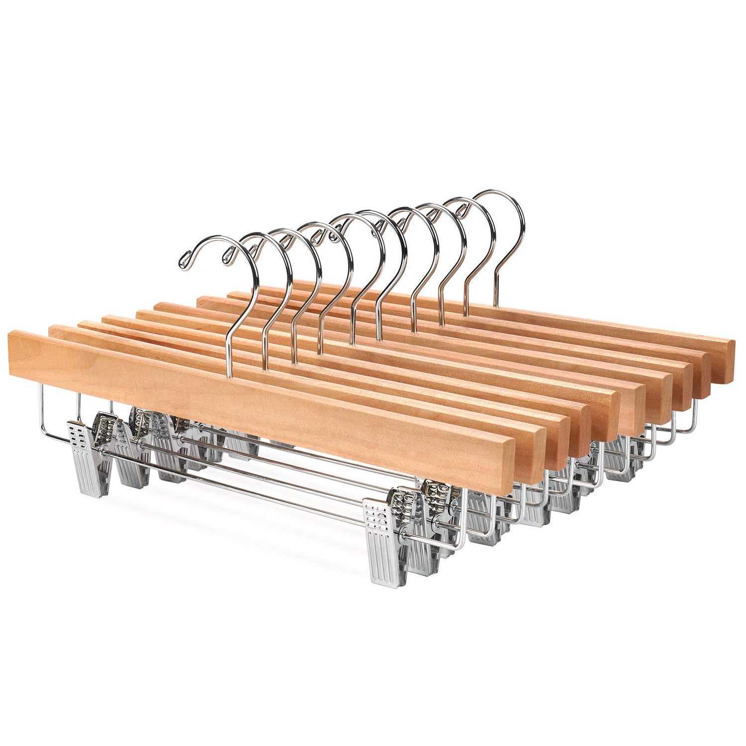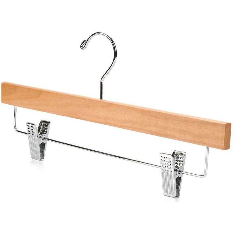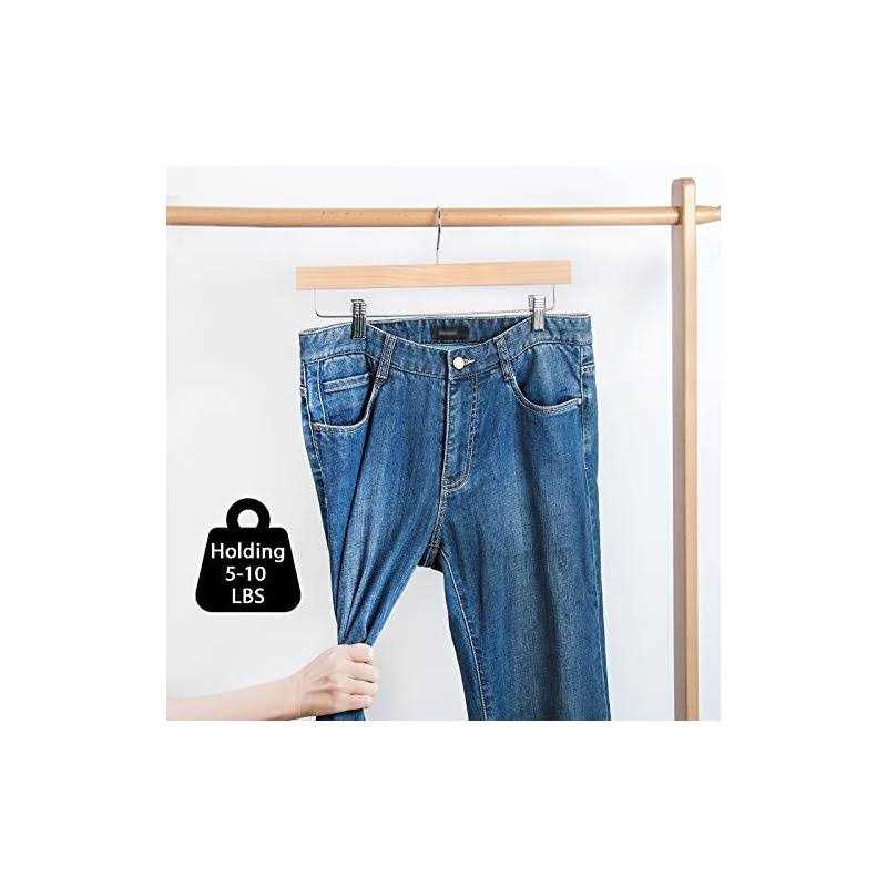 Smooth Surface protect your hand and clothes from abrading. Non-slip steel grip clips with Cushioned clamps for hanging pants skirt A chrome 360 degree hook lets users easily hang clothing from any angle. Heavy duty hardwood strong enough to sustain all kind of pants and skirts.Dimensions: 14″L x 0.47″W x 6.7″H.