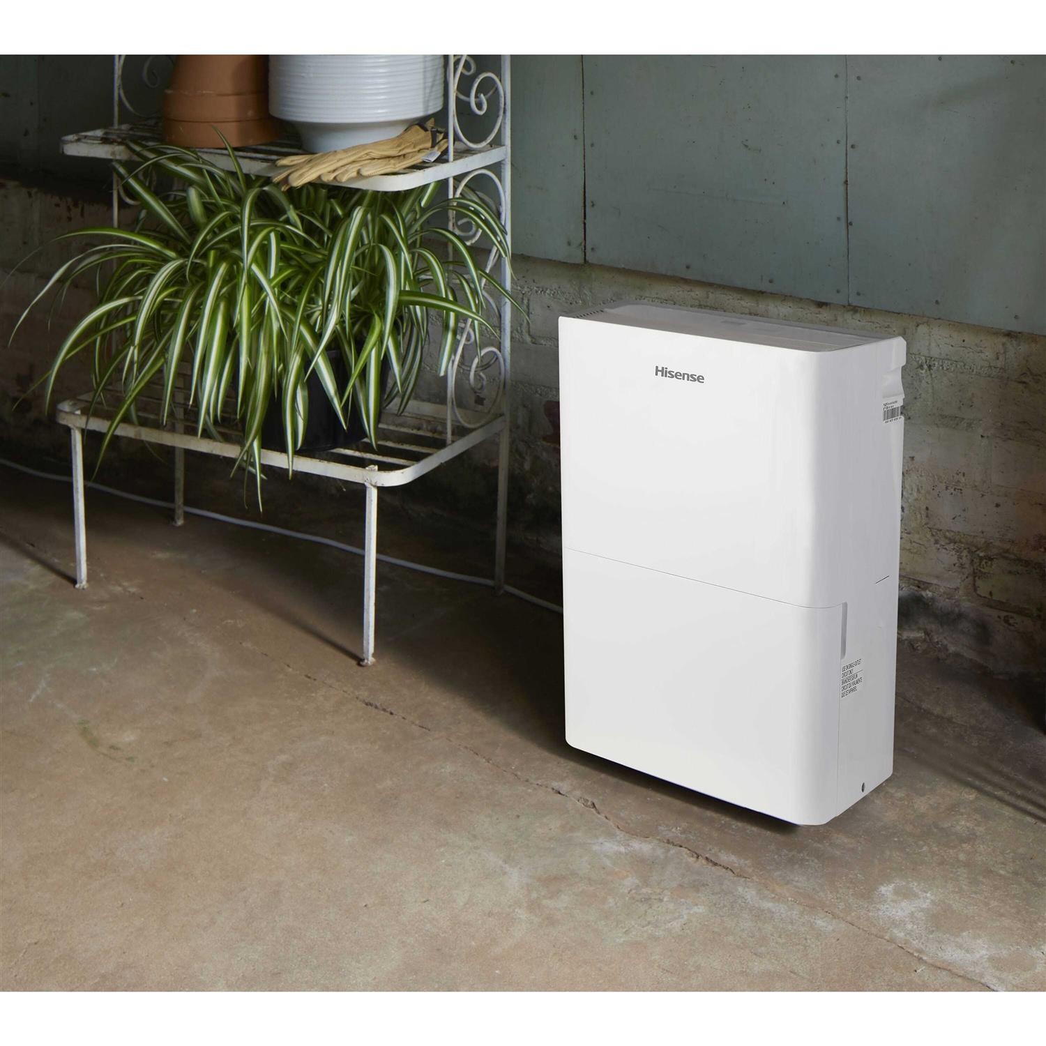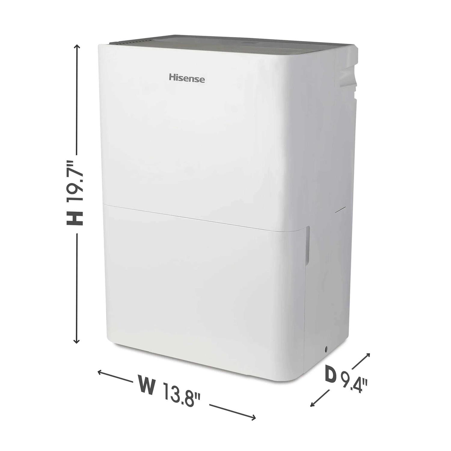 Compact size is ideal for smaller spaces, Quiet operation for a relaxing environment Easy-carry handle for portability, Works effectively in rooms as cool as 38°F Meets ENERGY STAR standards, saving on energy costs, Easy slide-out bucket design makes emptying a breeze Auto shut-off stops collecting water when full, Washable, removable filter for quick, easy cleaning The Hisense DH5022K1W Compact Dehumidifier is designed to fit in small spaces and can remove up to 35 pints of moisture at a time from rooms as large as 300 sq. ft. It is designed to work in a cool environment, as low as 38°F, which is just right for unheated garages and basements. The easy-carry handle makes it easy to move from room to room, and an automatic shut-off feature helps prevent accidental overflow. Its efficient design meets ENERGY STAR requirements and provides quiet operation.