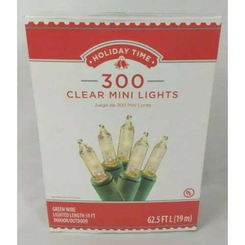 Decorate your home so it’s ready for entertaining and wish all of your guests a happy holiday season with Holiday Time’s 300 Clear Mini Lights with Green Wire. This package of 62.5 ft. of 300 Clear Mini Lights from Holiday Time is designed for both indoor and outdoor use, and is all youll need to add a special touch to your dcor this season and get everyone in the holiday spirit. The pack includes (2) 150-count light sets featuring bulbs that will shine bright when plugged in and stay lit even if one burns out. The bulbs come on 62.5 ft. of generously sized green wire that will blend in seamlessly with branches. The durable holiday lights are versatile and can be used for a wide range of dcor styles in a wide range of homes, making them great for use time and time again! Pick up these 300 Clear Mini Lights from Holiday Time and see how great they look in and around your home!