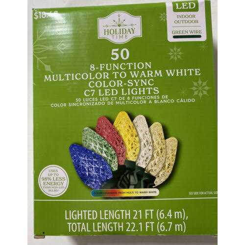 The Holiday Time 50-Count 8-Function Color-Sync LED C7 Christmas Lights are like getting 2 sets of lights in one. These lights go alternate colors to brighten your home and holidays beautifully. Energy-star certified these LED Christmas lights help save energy and remain cool to the touch even when lit. Crafted with green wire to blend in with tree branches and greenery, this strand features 50 diamond-cut LED C7 Christmas lights has a lighted length of 21 feet, and a total length of 22.1 feet. Eight lighting functions include Steady on-Color A, Steady on-Color B, Color change-(fast), Color change-(twinkling), Color change-(slow), Fade in/fade out-Color A, Fade in/fade out-Color B, and Combination. Designed with durable, break-, fade-, and chip-resistant LED bulbs, you can connect to up to 60 strings of this exact set. These lights are available in 3 festive colors: Blue/Cool White, Red/Green, and Multicolor/Warm White. The Holiday Time 50-Count Color-Sync LED C7 Christmas Lights are a fun and colorful addition to your holiday decorations.