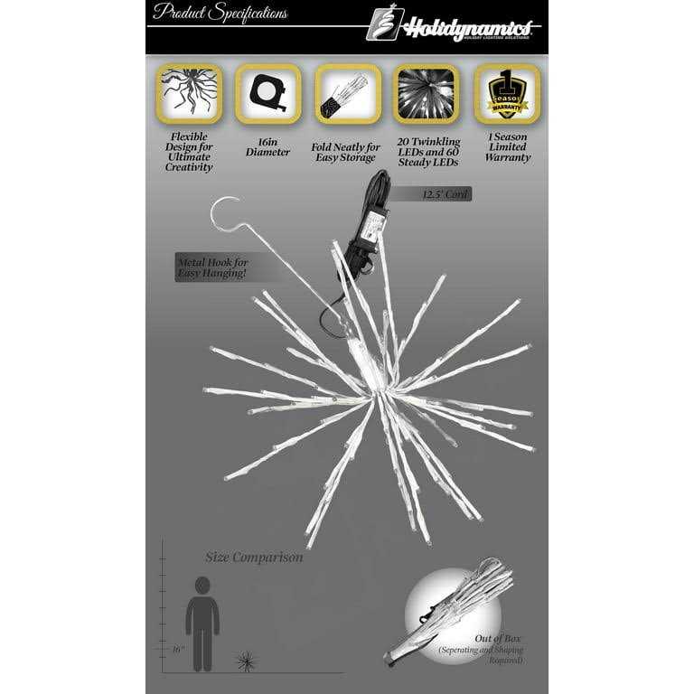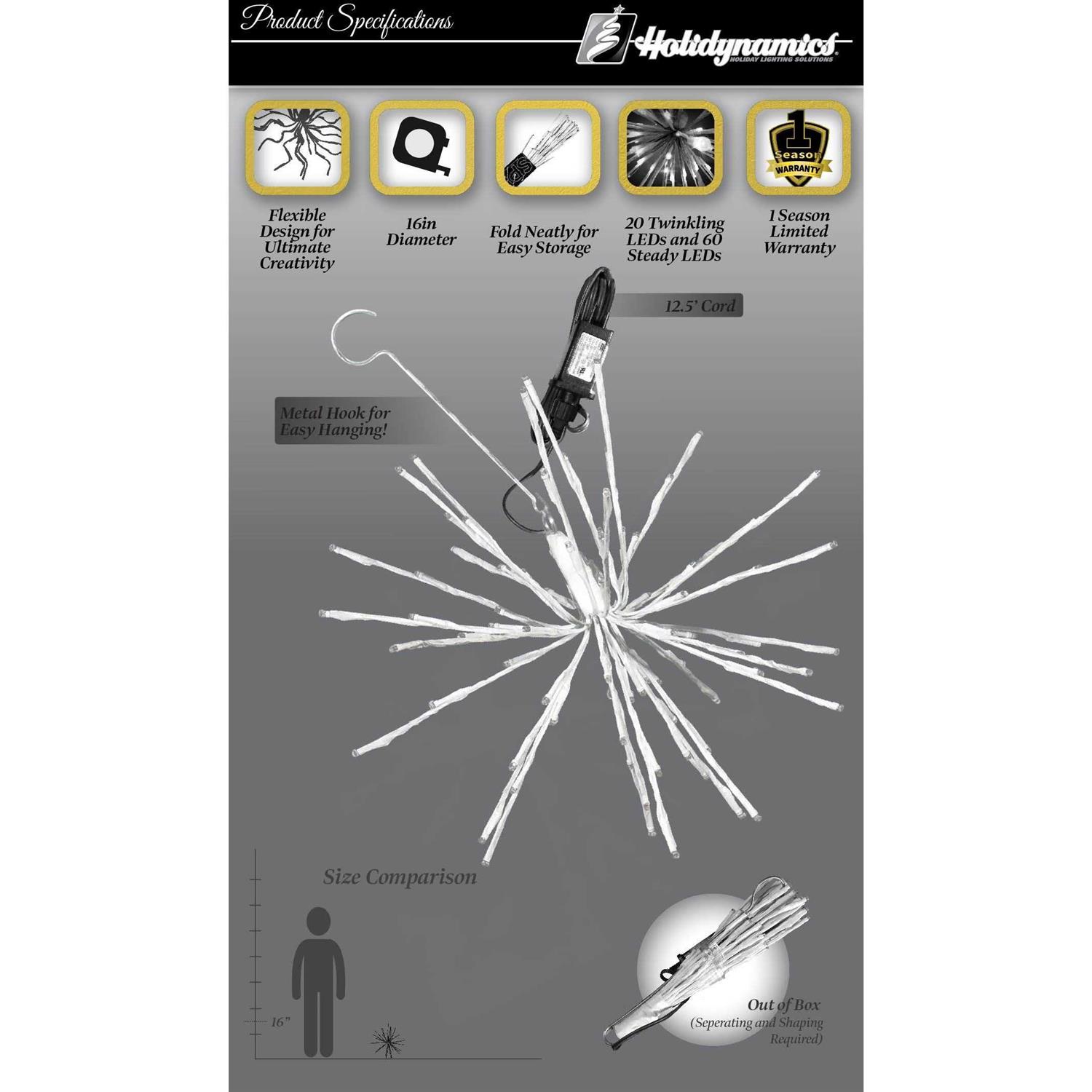 Holidynamics, Inc 16 inch Pure White LED Spritzers are second to none for your go to lighted holiday dcor! More durable and longer lasting than the typical Firework Light, Spritzers are built for outdoor use! Flexible construction allows you unlimited options when you decorate. Spritzers can be fanned out in an orb, laid flat, twisted, curled, whatever you like. And when you are done for the season, they collapse nice and neat for storage!