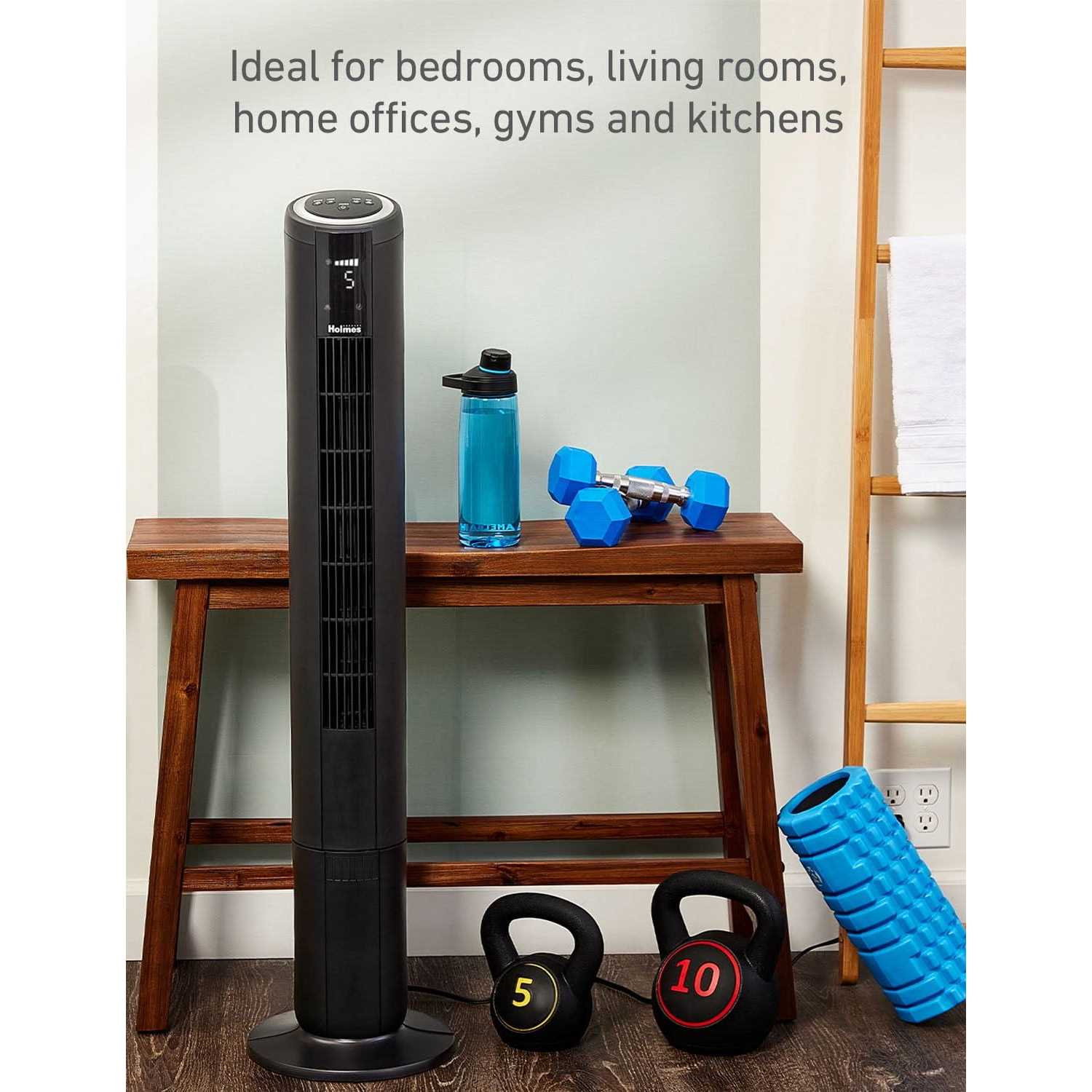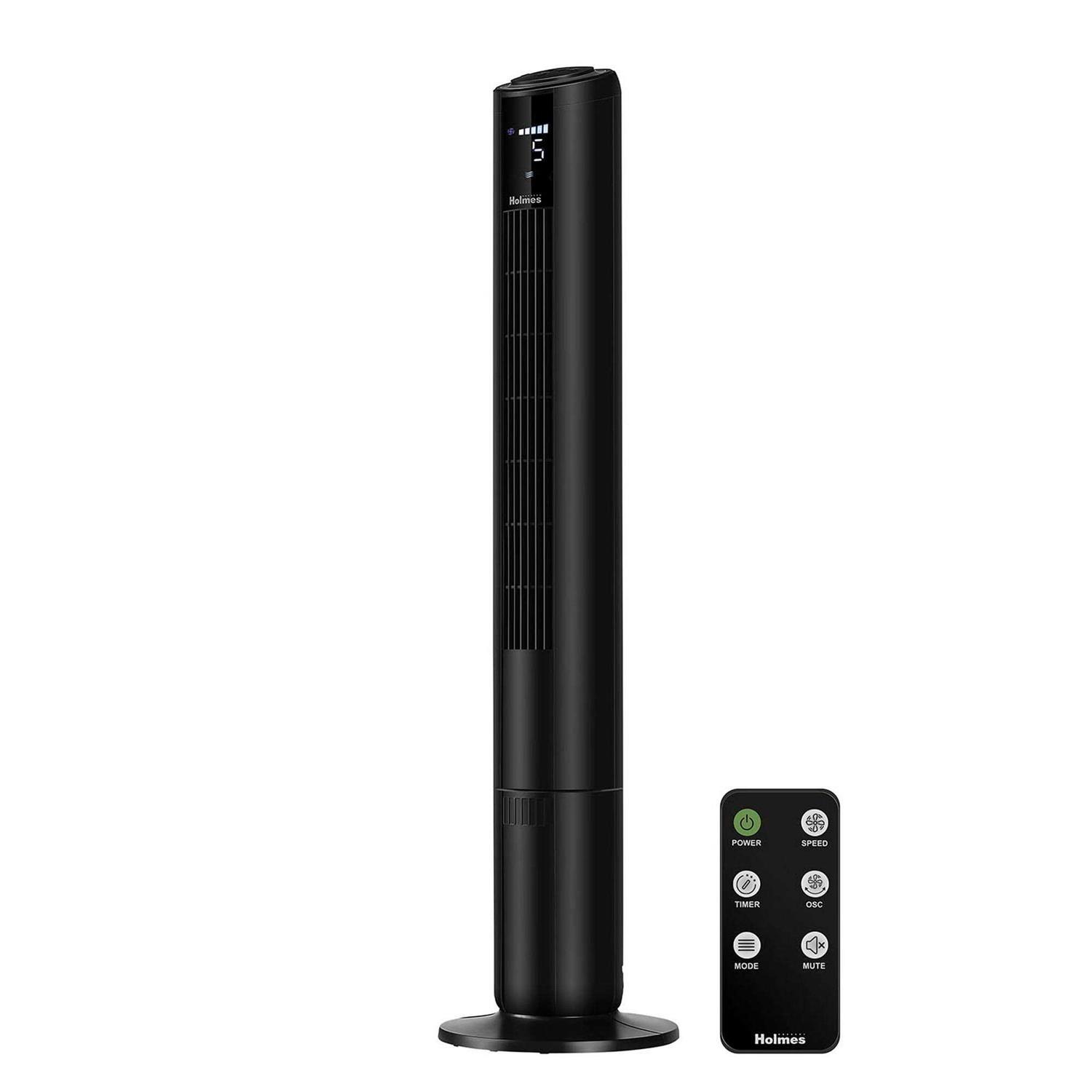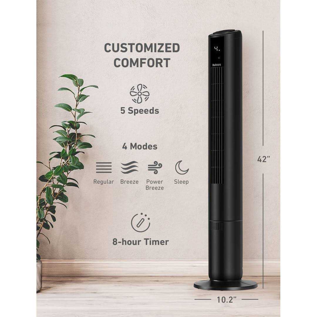 Holmes 42 Digital Tower Fan makes cooling your home a breeze. It features a ClearRead LCD display to easily operate the fan and adjust the settings. Includes 5 speed options, up to 16.4ft/sec high-speed velocity, and 4 operation modes; normal, sleep, breeze, and power breeze to customize your cooling experience. This slim, compact tower fan is ideal for larger living areas where floor space is limited, including bedrooms, kitchens, living rooms and home offices, includes an integrated carrying handle to easily move from one room to the next. Rest easy with the soothing sleep mode option and up to 8 hour auto-shut off timer to conveniently turn off the tower fan. Motorized 80 oscillation delivers cool airflow for wide areas and the convenient remote control lets you operate the fan’s features from across the room.