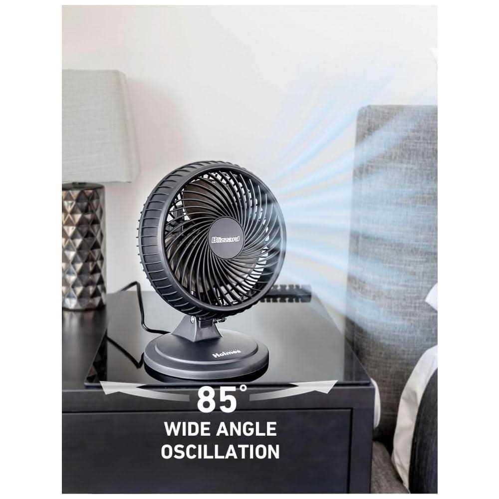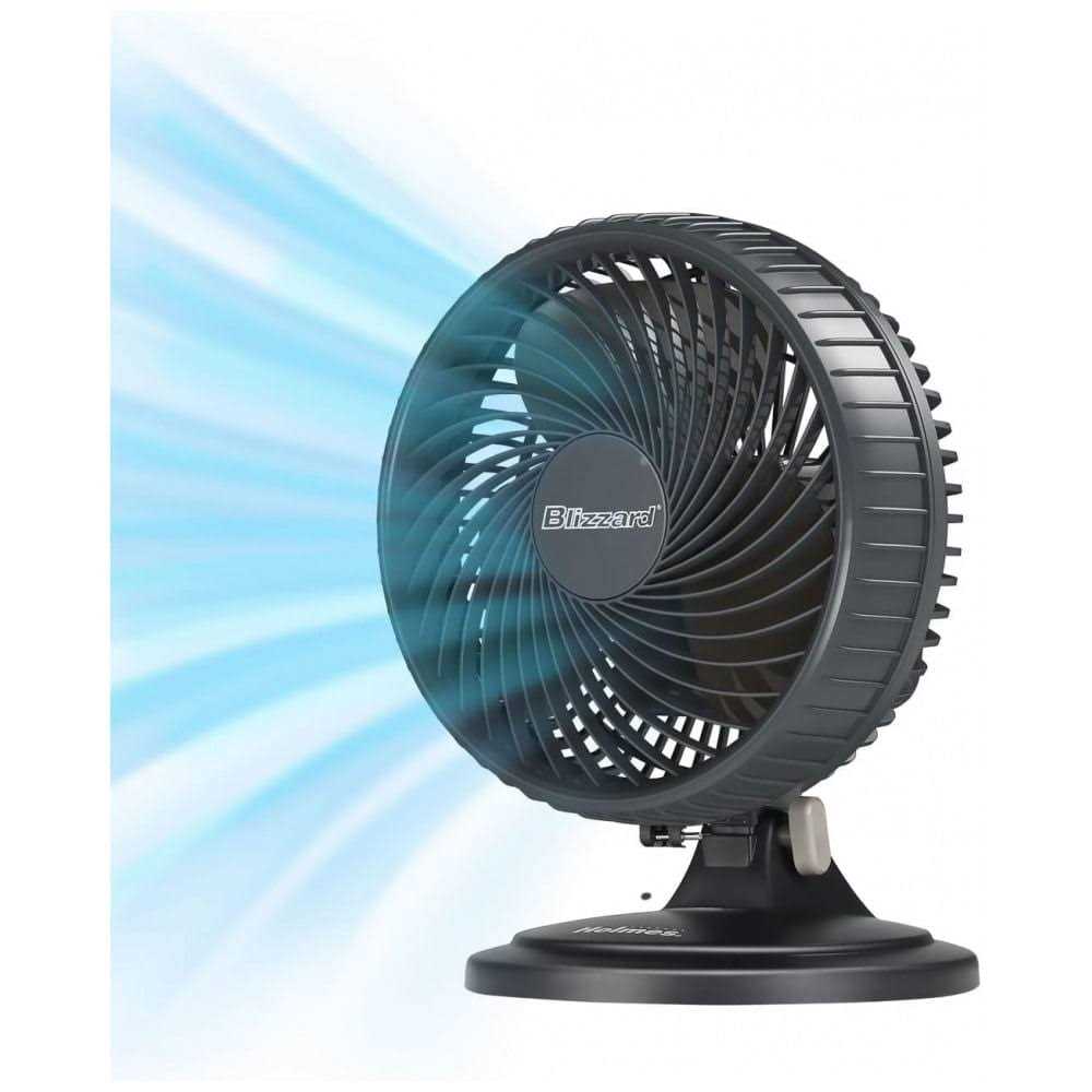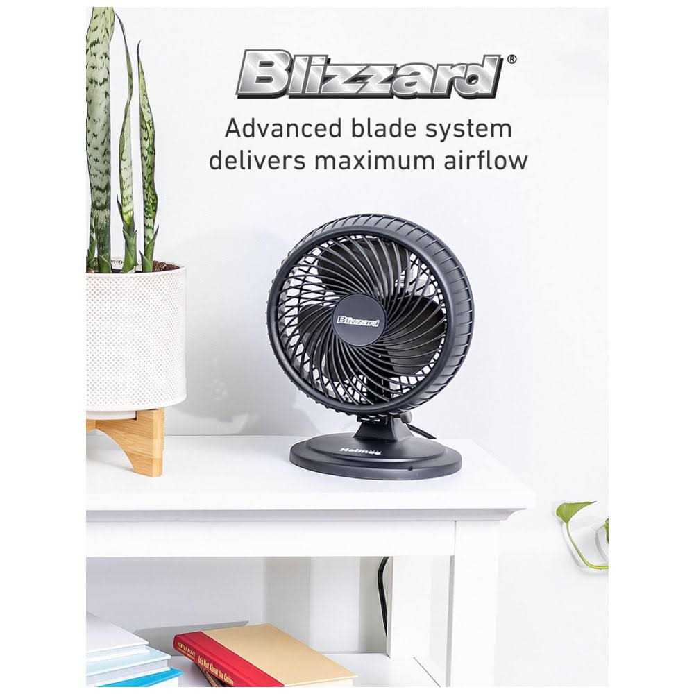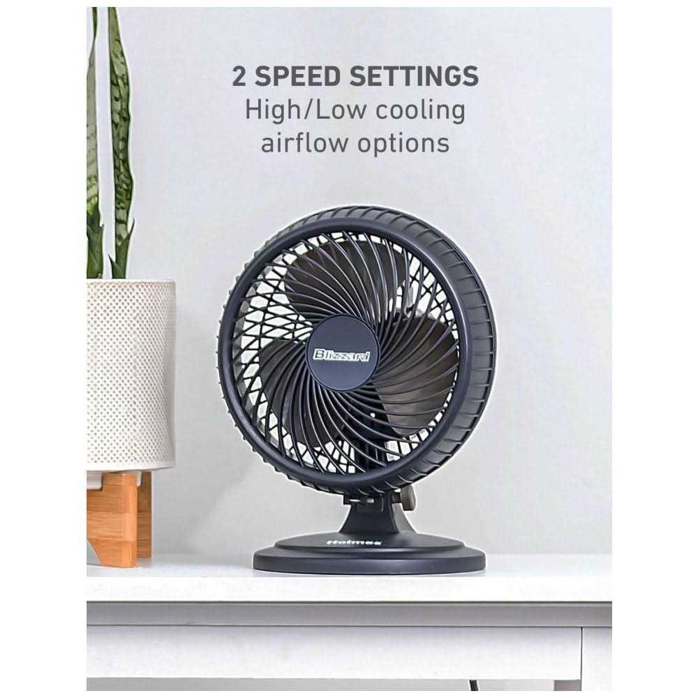 Table Fans by HOLMES. Details:This Blizzard 2-Speed Oscillating Table Fan from Holmes delivers targeted airflow on-demand. Adjust this black three-blade fan as you see fit with its tilting head, two speed settings, and 70-degree multi-directional oscillation.