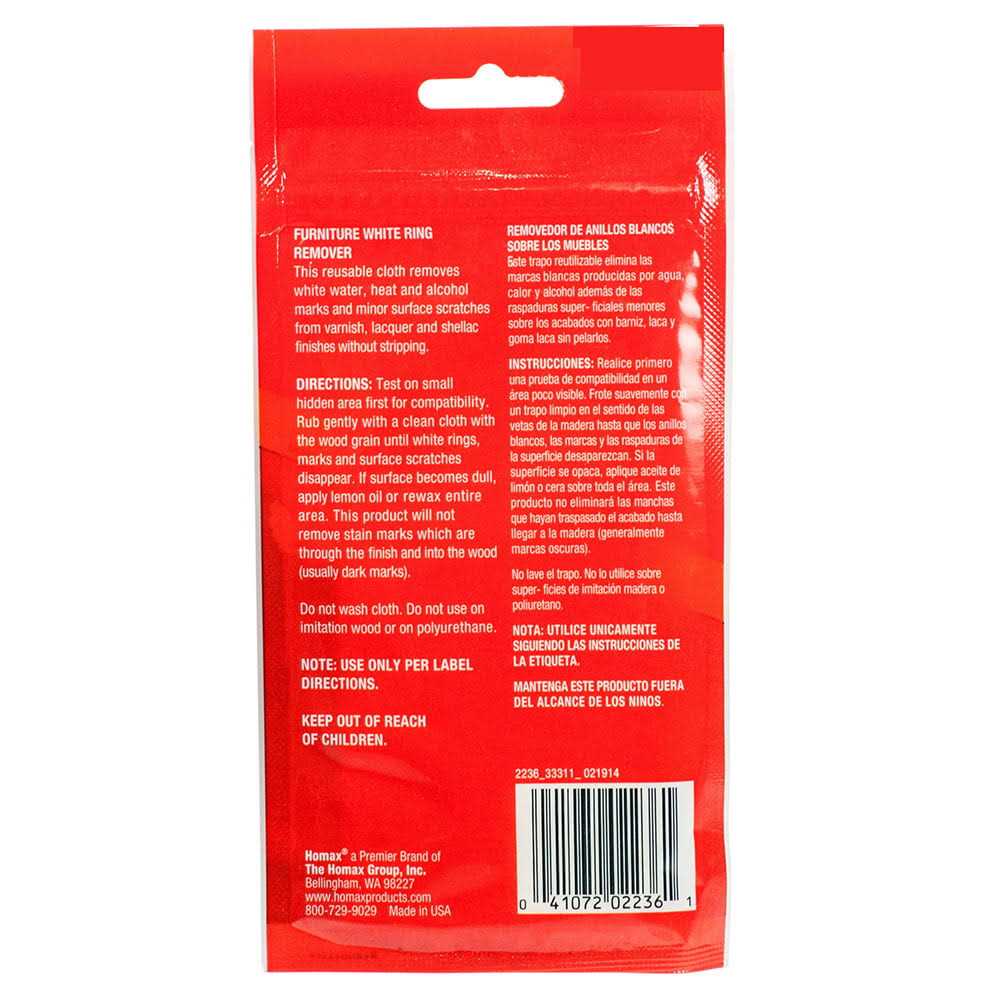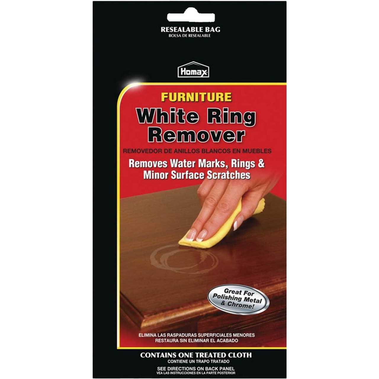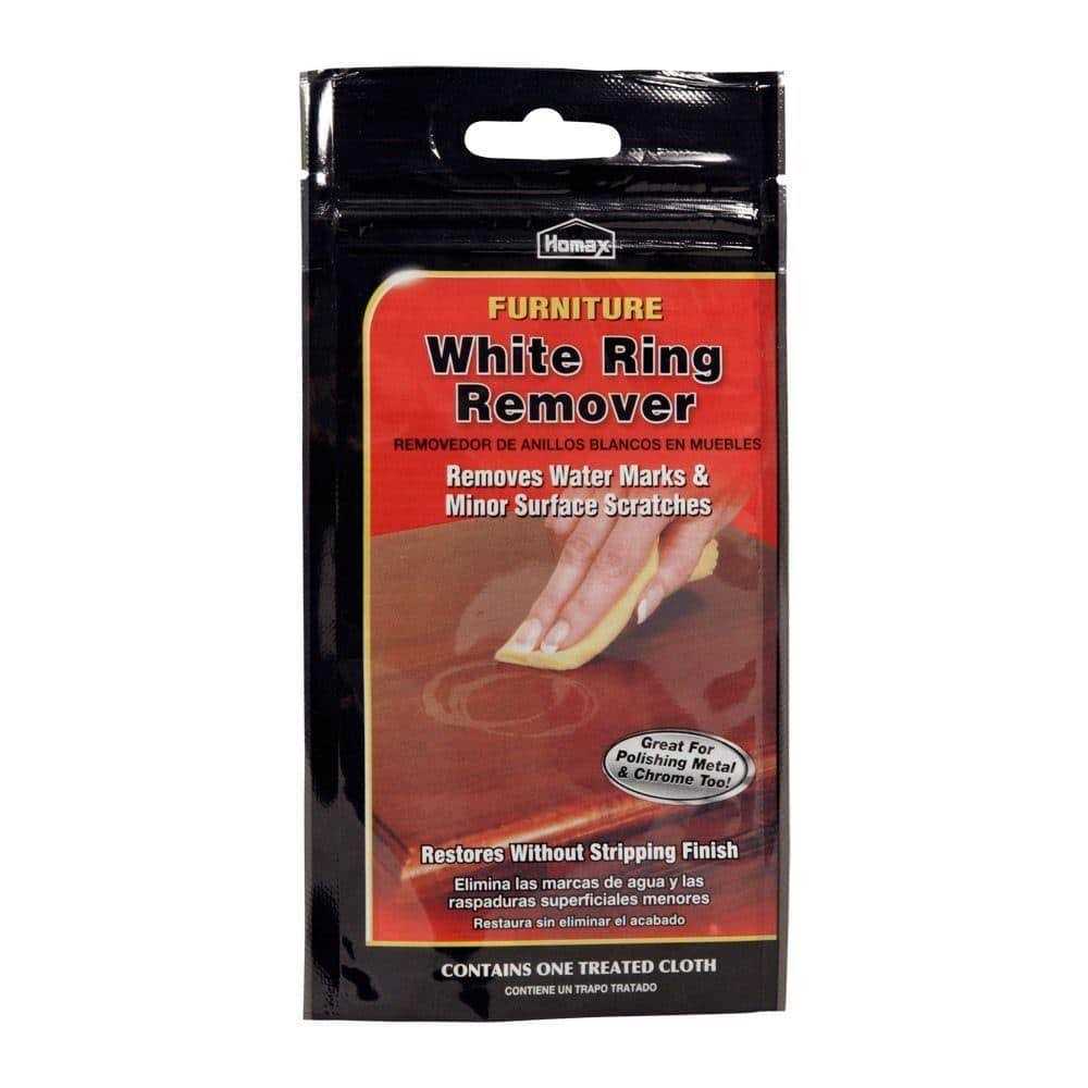 Homax Furniture White Ring Remover Cloth makes heat and watermarks disappear without stripping or harming the finish of wood furniture. Specially treated white ring remover cloth helps restore furniture without expensive refinishing. It also removes minor scratches, magic markers and pens from wood finishes, and removes tarnish and oxidization from copper and brass. Contains one (1) treated cloth in a resealable bag.