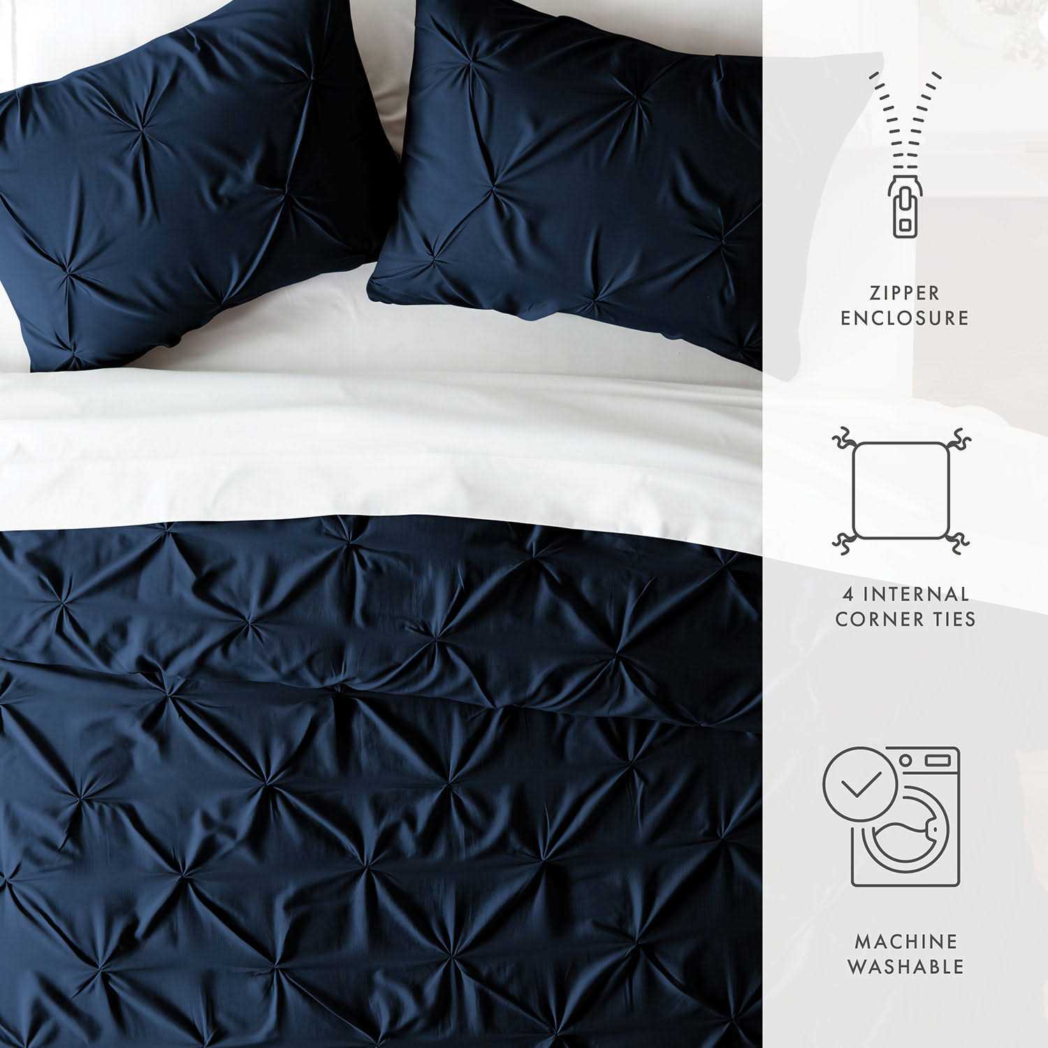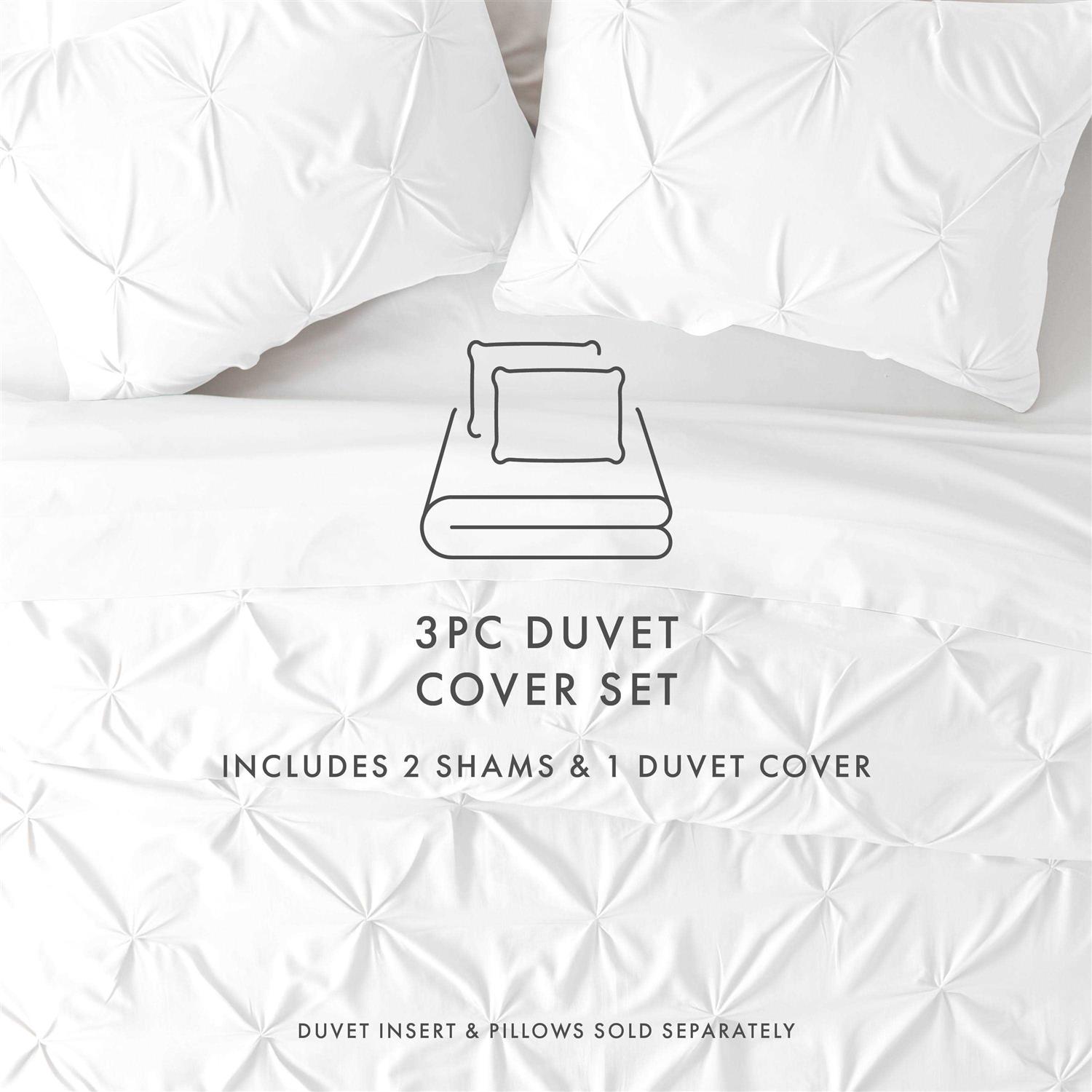 Give your old comforter or duvet insert a refreshing new look with this 3 piece duvet cover set. Featuring an elegant pinch pleat design, our premium yarns are twice as durable as cotton, wrinkle resistant and each piece has been double brushed for a super soft, comfortable feel. Description: Microfiber Imported Machine wash cold. Tumble dry low. Do not bleach, iron, or use softener.