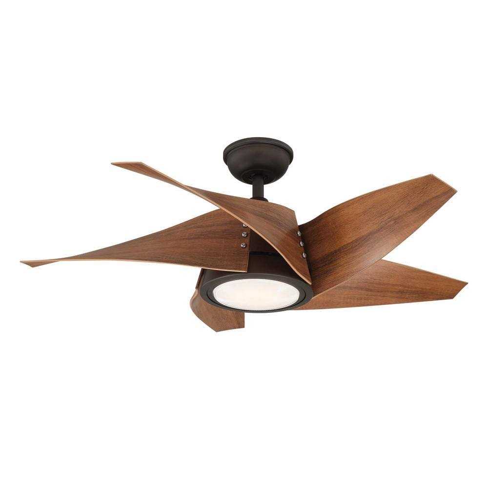 LED Indoor/Outdoor Espresso Bronze Ceiling Fan can be used both indoors and outdoors in small areas. Has a unique blade design as well as a glass light kit for a very modern/retro look. The 14-Watt Samsung LED light kit will provide enough light as well as energy efficiency. The handy remote operates both the fan speed and light dimming and includes batteries. 4-hickory weather resistant blades Dome style light kit Uses 14-W Samsung LED module 3000K LED temperature warm white Decorative canopy ring and coupling cover to conceal any exposed screws Hand held remote control for light and speed operation included battery Damp rated for covered ceiling installation Down rod use only Small room 10 ft. x 10 ft.