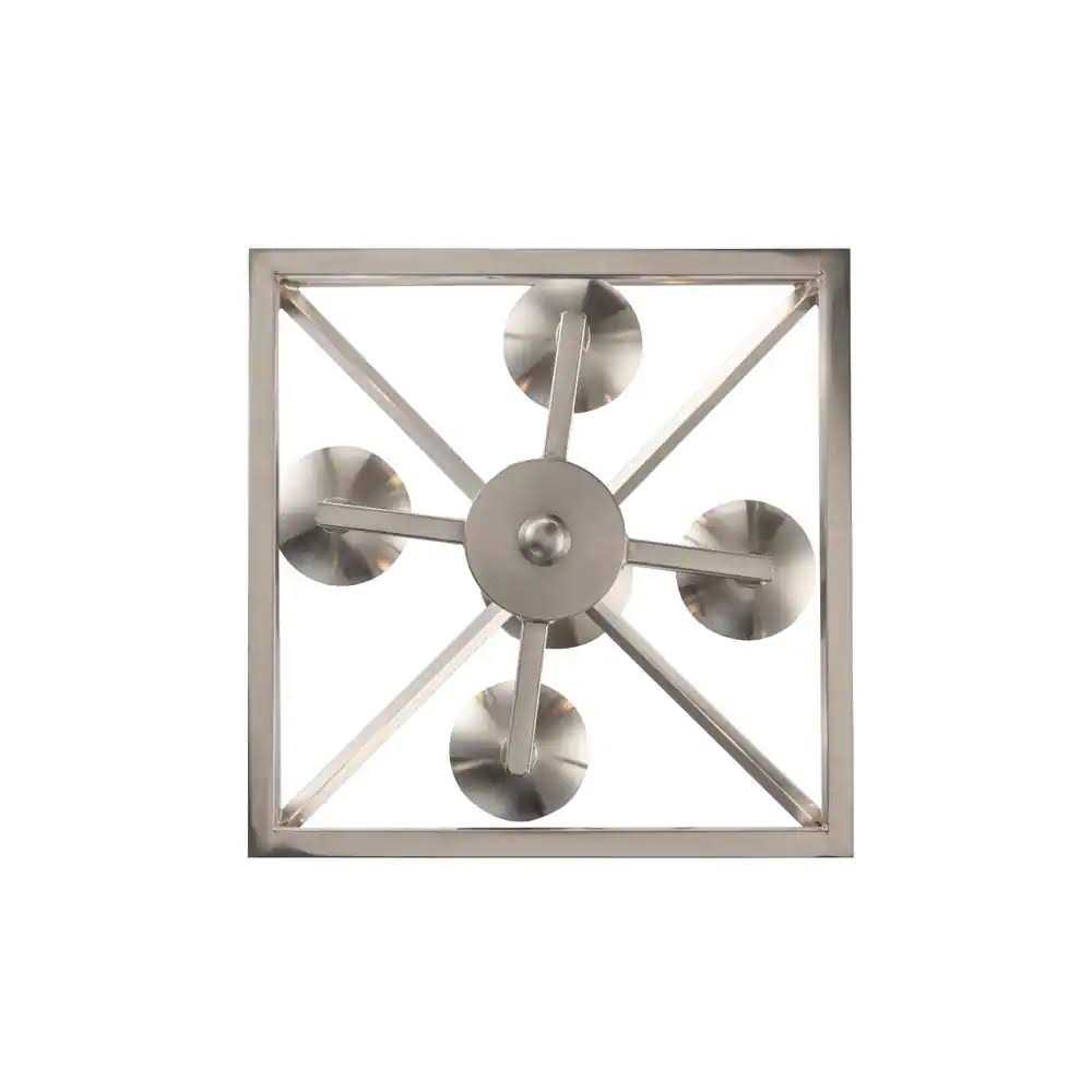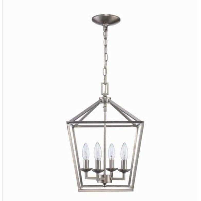 Enhance your entryway, kitchen or dining room with the classic styling of this 4-light chandelier. Highlighted by a stylish brushed nickel finish and contemporary metal birdcage, this fixture adds a warm glow to a variety of indoor spaces. The open caged shade exposes the candelabra style bulbs for a classic look, perfect for providing ample task lighting. This adjustable chandelier is mounted with a matching ceiling canopy and includes 5 ft. of chain for a customizable suspension height. Farmhouse chandelier with a brushed nickel finish Includes 60 in. chain for adjustable hanging height from 20 in. up to 79 in. Round ceiling plate measures 5 in.